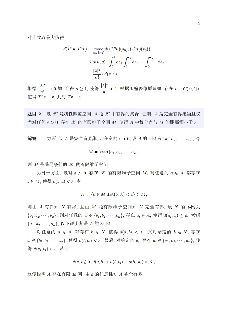 泛函分析期中测试解答统计91董晟渤2021年11月16日题目1.设f(z)是0,1]上的连续函数.证明:对任何实数入∈R,必存在唯一的u∈C(0,1])满足如下形式的积分方程:u(x)=f(x)+入e-u(s)ds.解答.在原积分方程两端同时除以~”,则原积分方程等价于u(x)e-x=fx)e-r+入u(s)e-ds.令v(a)=u(x)e,g(x)=f(x)e”∈C(0,1),只需证明积分方程(=g()+入v(s)ds存在唯一解u∈C(0,》.考虑T:C(0,)→C(0,,(T(=f回)+入(sds,只需验证存在n≥1,使得Tm是压缩映像.计算得d()()))d≤IW,d-w(s.(T-6sdssF."d "d((Tn-2u)(s2),(Tn-2v)(s2))ds2d…d(u(sn),v(sn))dsn,1