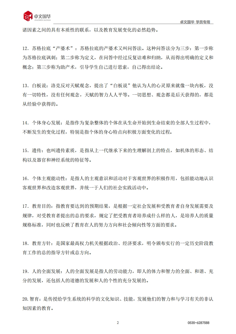 卓文国华卓文国华学员专用教师招骋考试教育基础知识名词解释【200个精选常考词条】1.教育:教育是一定社会背景下发生的促使个体社会化和社会的个性化的实践活动。2.广义的教育,指增进人的知识与技能、发展人的智力与体力、影响人的思想观念的活动。它包括社会教育、学校教育和家庭教育。3.狭义的教育:指学校教育,是教育者依据一定的社会要求,依据受教育者的身心发展规律,有目的、有计划、有组织地对受教育者施加影响,促使其朝着所期望的方向发展变化的活动。4.教育媒介:指建构于教育者和被教育者之间起桥梁或沟通作用的一切事物的总和,包括教育内容、教育方法与组织形式和教育手段等。5.教育功能:指教育者在教育教学活动中通过教育媒介对受教育者的个体发展和社会发展所产生的影响和作用。6.六艺:是两周各级各类学校教育的基本学科,具体指礼、乐、射、御、书、数。7.七艺:教会教育的教育内容,包括“三科”(文法、修辞、辩证法)和“四学”算术、几何、天文、音乐)。8.教育学:是研究教育现象和教育问题,揭示教育规律的一门科学。9.教育现象:是教育活动在运动发展中的表现形式,是教育活动外在的、表面的特征,包括社会现象和教育认识现象。10.教育问题:是指反映到人们大脑中的、需要探明和解决的教育实际矛盾和理论疑难。11.教育规律:是教育活动内在的本质的和必然的联系,包括教育内部诸要素、教育与外部0535-6287588