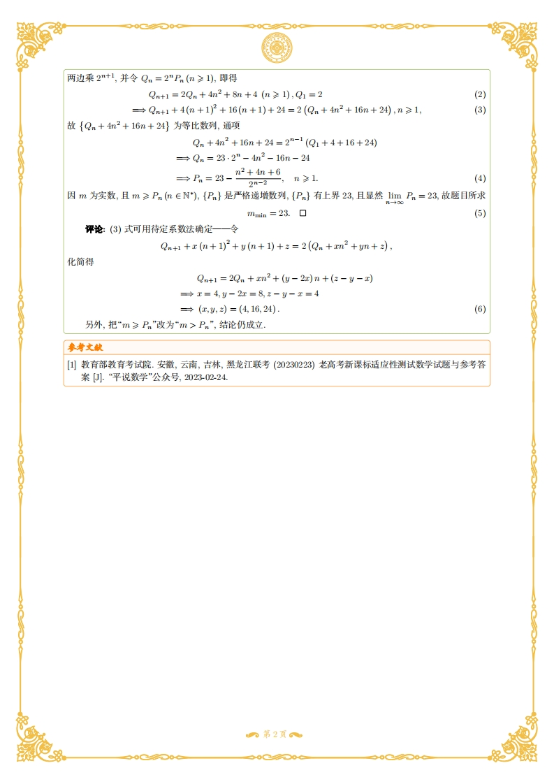 ●0日数恋教情数肯年四者鸡考款学息19研与推户血华南师范大学吴康S1.题19的解答言教有部四省联考(2023-02-23)数学回题19:19(12分)记数列{an}的前n项和为Tn,且a1=1,an=Tn-1(n≥2).(1)求数列{an}的通项公式:因设m为整致,且对任意€,m≥。+品++二求m的最小值a1 a2解析解(1)a1=1=T1,a2=T1=1,ag=T2=a1+a2=2,a4=T3=2+ag=4,…,易得am=2n-2(m≥2),故所求通项公式为am=1(n=1)或2m-2(m≥2).(1)②设8=1+2+…+”a1 02,n∈,则S=1,且易得n+1Sm+1=Sn+2n(n≥1).(2)两边乘2n+1,并令Un=2"Sn(m≥1),即得Um+1=2Un+4n+4(m≥1),U1=2(3)→Un+1+4(m+1)+8=2(Un+4n+8),n≥1,(4)故{Um+4n+8}为等比数列,通项Um+4n+8=2n-1(U1+4+8)→Un=7.2m-4n-8(5)8=7-+号,n≥1(6)因m为整数且m≥Sm(n∈N*),而7>Sm(m∈N*)且m≥S6=6.5,故所求mmin =7.(7)评论:(4)式可用待定系数法确定,详略.“m为整数”"可改为“m为实数”,结论仍成立.“m≥Sn”可改为“m>S”,结论仍成立.§2.题19的推广19A.记数列{an}的前n项和为Tn,且a1=1,an=Tn-1(m≥2).(1)求数列{an}的通项公式;1222(2)设m为实数,m≥Pn=an∈Nr),求m的最小值an解析解(1)同上(2)乃=1,P=1+4=5,易得P+1=乃+n+122n-1(m≥1).(1)un第1页