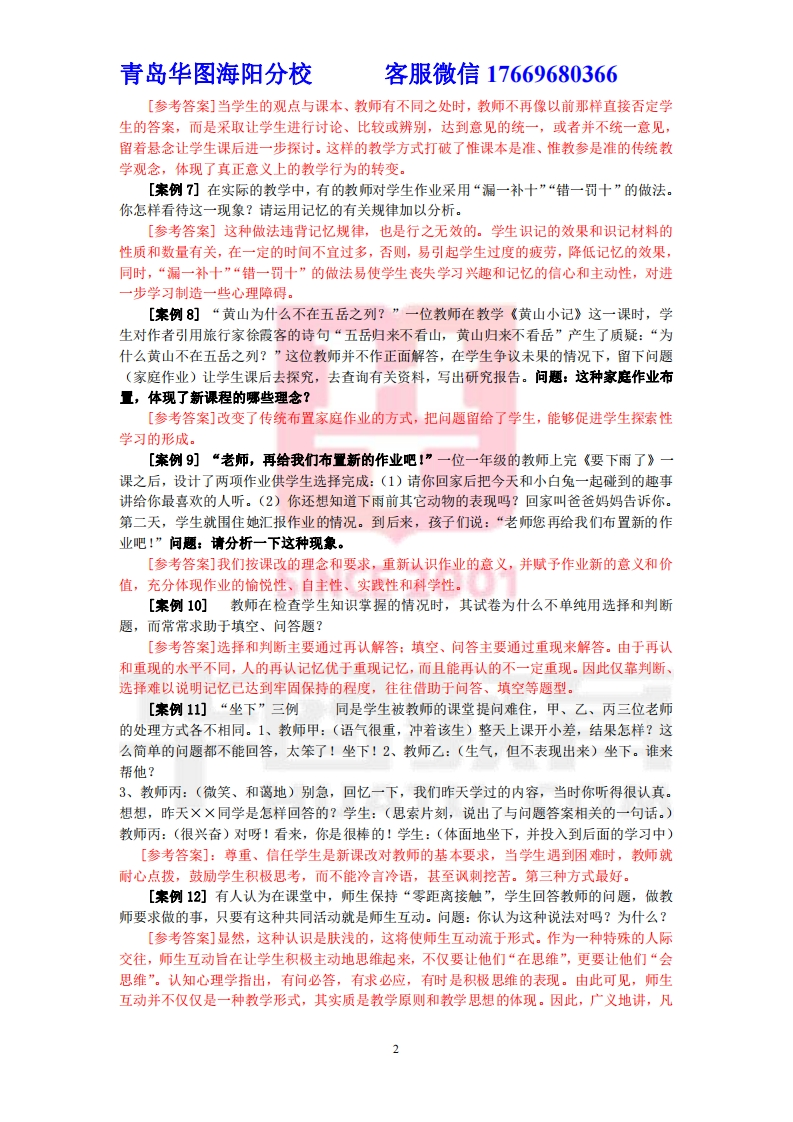 青岛华图海阳分校客服微信17669680366教育教学案例分析经典试题100例(附答案)[案例1]教学生识字有很多技巧,有一位教师告诉学生如何区别“买卖”两个字时说:“多了就卖,少了就买。”学生很快记住了这两个字。还有的学生把“干燥”写成“干躁”,把“急躁”写成“急燥”,老师就教学生记住:“干燥防失火,急躁必跺足。”从此以后,学生对这两个字再也不混淆了。这些教法有何心理学依据?[参考答案]这些教法对我们有很好的启发和借鉴作用。心理学的知识告诉我们:凡是有意义的材料,必须让学生学会积极开动脑筋,找出材料之间的联系:对无意义的材料,应尽量赋予其人为的意义,在理解的基础上进行识记,记忆效果就好。简言之,教师应教学生进行意义识记。[案例2]在课堂上,教师让学生“列举砖头的用处”时,学生小方的回答是:“造房子,造仓库,造学校,铺路”:学生小明的回答是:“盖房子,盖花坛,打狗,敲钉”,请问小方和小明的回答如何?你更欣赏哪种回答?为什么?请根据思维的原理进行分析。[参考答案]小方回答砖头的用途都是沿着用作“建筑材料”这一方向发散出来的,几平没有变通性。而小明的回答不仅想到了砖头可作建筑材料,还可作防身的武器,敲打的工具,这样的发散思维变通性就好,其新的思路和想法,有利于创造性思维的发展。[案例3]一位热情而热爱教育工作的教师为了使学生更好地学习及提供一个更有情趣的学习环境。新学年开始了,他对教室进行了一番精心的布置,教室内周围的墙上张贴了各种各样、生动有趣的图画,窗台上还摆上了花草、植物,使课室充满了生机。请你判断,它将产生什么样的效果?为什么?[参考答案]这位热情的教师出发点虽然很好,但事与愿违,反而产生分散学生注意,影响学生集中学习的效果。根据无意注意的规律,有趣的图画,室内的花草、植物这些新异的刺激物吸引了学生的注意,尤其对低年级学生,他们容易把注意转移到欣赏图画、花草植物上,而影响了专心听课。[案例4幻“老师,我能不用书中的原话吗?”一位教师在教学《两条小溪的对话》时,老师让学生分角色表演。有一位学生问:“老师,我能不用书中的原话吗?”老师和离地问:“为什么呢?”“因为书中的原话太长,我背不下来,如拿着书表演,又不太好。”孩子说出了原因。“你的意见很好,用自己的话来表演吧。”老师高兴地抚摸了一下孩子的头。果然,这个孩子表演得非常出色。问题:请评价一下这位老师的做法。[参考答案]师生平等关系的形成是课堂民主的具体体现,教师从过去的知识传授者、权威者转变为学生学习的帮助者和学习的伙伴。教师没有了架子,尊重学生的意见,让学生真正感到平等和亲切,师生间实现零距离接触,民主和谐的课堂氛围逐步形成。[案例5]教师在板书生字时,常把形近字的相同部分与相异部分分别用白色和红色的粉笔写出来,目的是什么?符合什么规律?[参考答案]目的是加大形近字的区别,使学生易于草握形近字。(1)符合知觉选择性规律:知觉对象与知觉背景差别越大,对象越容易被人知觉。(2)符合感觉的相互作用中同时性对比规律:红白形成鲜明的对比,使学生容易区别形近字。[案例6]“不是果敢,是残忍。”一个青年教师在进行公开课《伊犁草原漫记》教学时,课文第二段第三层写秋天猎人猎熊的果敢,但一名学生没有按要求归纳猎人果敢的特点,而是说猎人残忍,同时指出猎人的行为是违法行为。原本课文中这一段是歌颂猎人的,学生却痛斥猎人的猎熊行为,这是教师所始料不及的。可喜的是,这位教师并不因为学生当着听课教师的面提出不同的观点而气恼或逃避,而是因势利导,让学生充分讨论,发表自己意见。最后全班学生从保护野生动物的角度出发,推翻了课文的观点。问题:请对这位散师的行为进行分析。