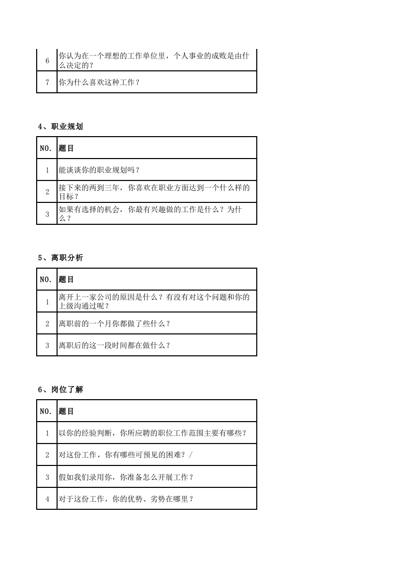 人力资源报表大全9-乡1、面试气氛营造NO.题目1欢迎你参加我们的这次面试!2今天天气很热(冷)…过来顺利吗?到这里来上班工作地点能接受吗?2、基本情况了解N0.题目1请你自我介绍一下请谈一下你自己性格方面的优缺点,这些会对你所应聘的2工作有影响吗?3在你朋友眼里,你是一个什么样的人?4有什么业余爱好?3、求职动机、态度N0.题目1为什么选择来我们公司工作?对这个行业、对我们公司你有什么了解吗?2你在选择工作时最看重的是什么?你更喜欢什么样的公司?请谈谈你现在的工作情况。包括待遇、工作性质、工作满意度等等。5你喜欢什么样的领导和同事?