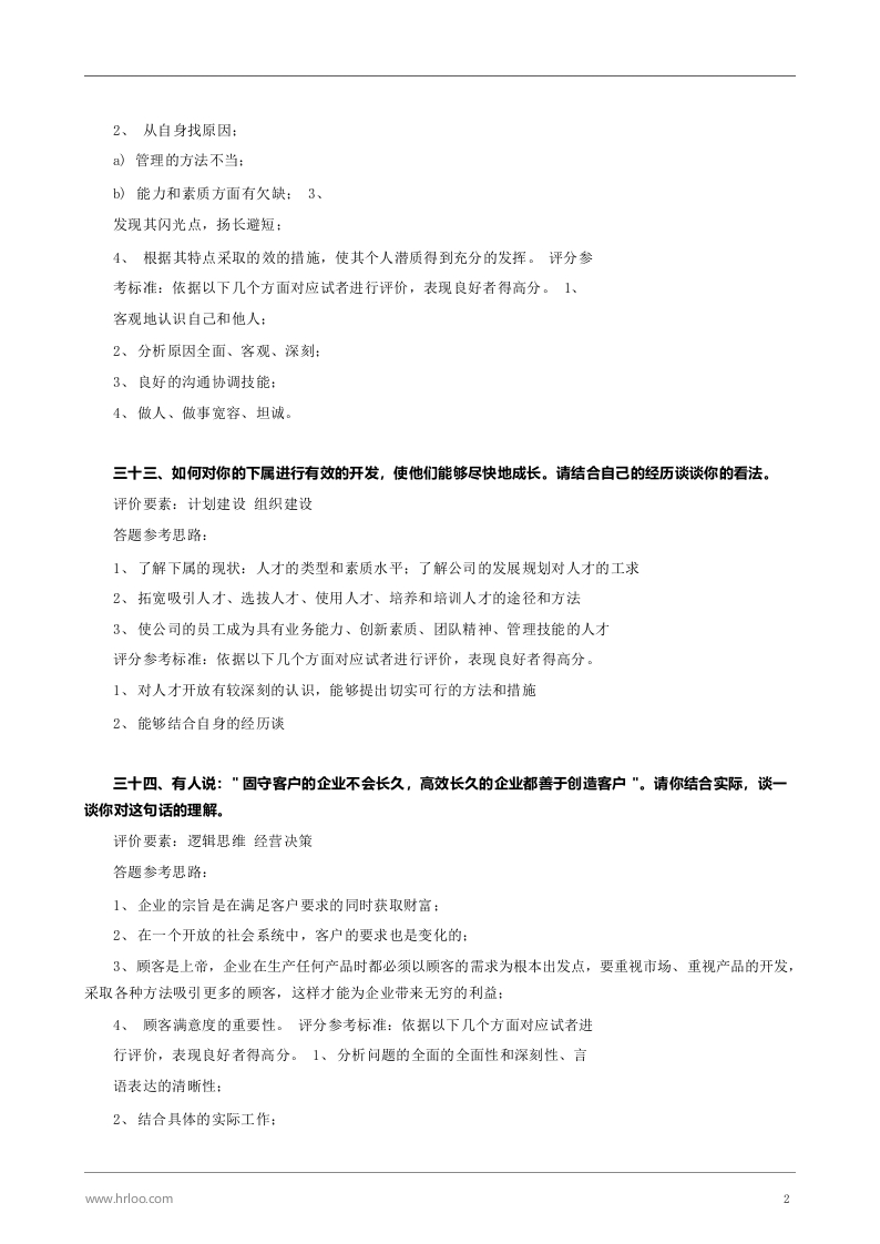 【结构化面试题库】下三十一、请结合你过去的经验,谈谈你应聘该职位的优势和劣势有哪些?并请你谈谈自己在新工作岗位上可能遇到的困难与挑战?评价要素:工作思路与内容知识经验逻辑思维答题参考思路:1、对自己优缺点的分析:2、对所应骋岗位的认识:3、对个人特点与所在岗位间联系的认识:4、对个人未来工作的展望。评分参考标准:依据以下几个方面对应试者进行评价,表现良好者得高分。1、对自己优缺点评价分析的深刻和客观程度:2、实事求是、诚实程度:3、个人特点与岗位的匹配程度:4、工作展望的创新性和求实性。三十二、假如你的一位下属认为问题有些偏激,在工作中常提出一些片面的理由,阻碍了你的工作。但此人很有责任心,工作又能吃苦,你如何与他相处?评价要素:工作思路与内容知识经验逻辑思维答题参考思路:1、分析这位下属的个性特点及原因:a)能力强,过于自信:b)思考问题过于狭隘:c)个性太强:d)对你可能有些误会:www.hrloo.com