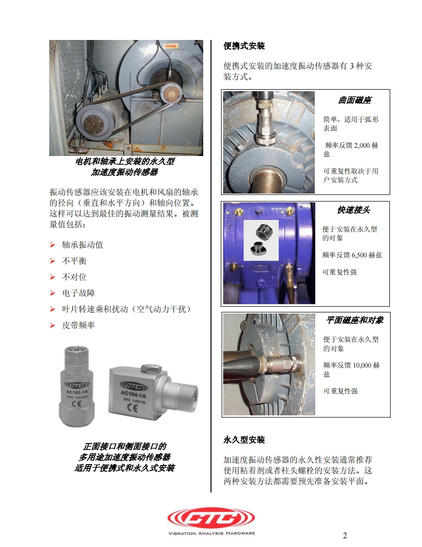 连接技术中心地址:590 Fishers Station DriveVictor.New York 14564免费电话:(800)999-5290m电话:(585)924-5900传真:(585)924-4680测量风扇和电机的振动值风扇和电机的轴承故障可以通过测量其振动值得以避免普通设备检测仪,定期进行振动测量是任何预防性维修措施的基础。测量,画趋势图,进行通常我们认为风扇和电机是很普通的设报警和分析风扇和电机的振动等措施可以备。但我们忽略了它们为工业加工过程提为故障的产生提供早期警告,提前定购该供了重要气流,为办公楼,会议中心,电替换的部件。轴承可以在定期维护期间得影院,娱乐场所和酒店提供了冷却,加到更换,避免不可修复的故障。热,加湿和去湿的功能。振动传感器虽然风扇和电机形状尺寸各异,但它们的故障形式却很相似。它们的轴承都经常被加速度振动传感器通常安装在电机和风扇忽略或工作过度,并且缺乏润滑,过热或的轴承的重要位置上。因为轴承是机械驱使用不当。这样,轴承磨损恶化并开始产动的主要承载部件,加速度振动传感器应生振动。测量振动值并分析其故障可以防该安装在输入和输出轴承机架上以便测量止如图所示的灾难性的失效方式。振动值。使用便携式数据采集器和永久型在线振动VIBRATION ANALYSIS HARDWARE1