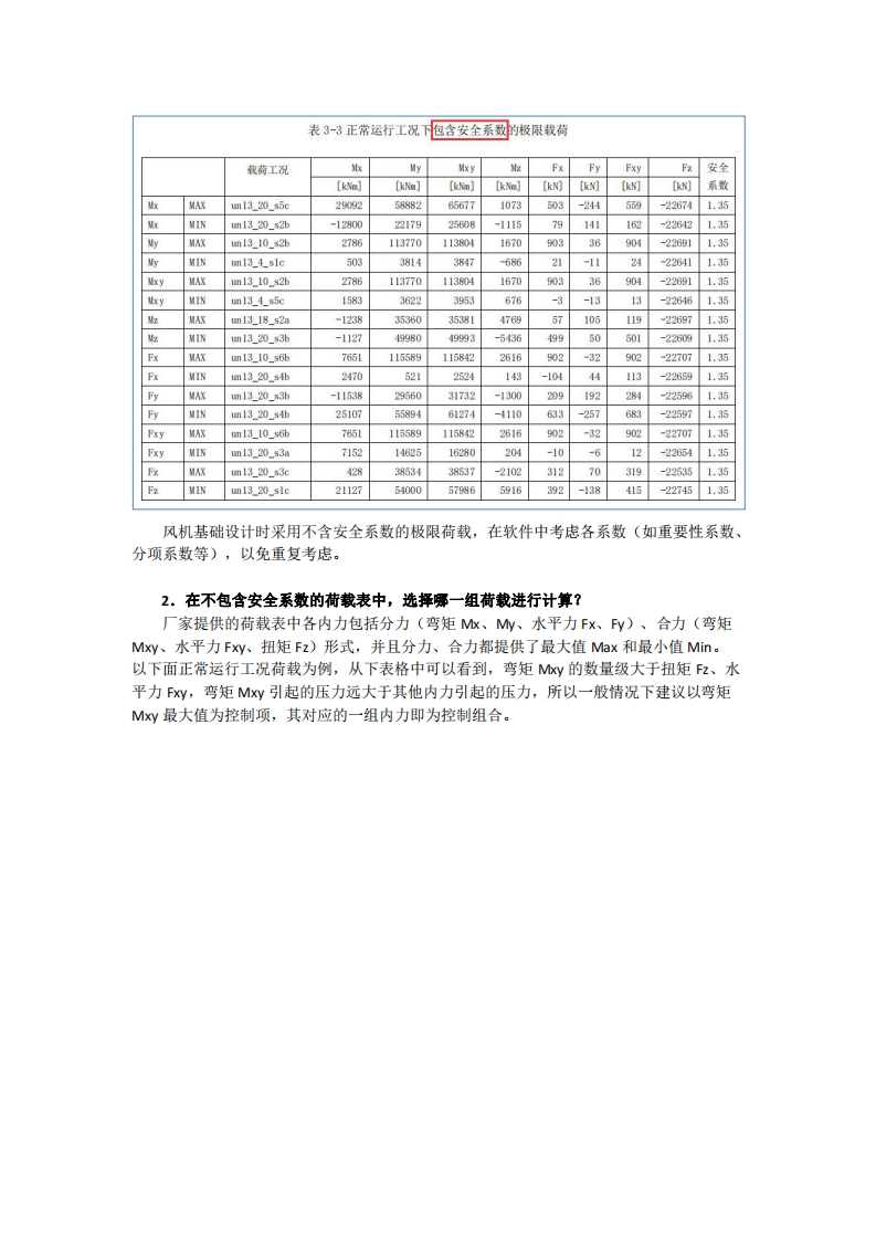 风机塔架基础设计在盈建科软件(YK-WTF)中的高频问题解析王晓可盈建科风电机组塔架地基基础设计软件(K-WTF)自从去年2月推出以来,受到广大设计师朋友的关注,越来越多的设计师朋友们使用了这款软件,并提出了宝贵意见!针对广大设计师的高频问题,整理了今天这篇文章,希望能解答工程师们在风机基础设计工作中的疑惑,让设计工作更加顺畅。一、厂家提供的风机荷貌如何取值在风机塔架基础设计中,设计师硼友们遇到的第一个问题是,如何读懂厂家提供的资料,在厂家提供的各种荷载表中,如何取用设计中需要的数值?1。厂家提供的荷载,取值时是否考虑安全系数?一般厂家提供的极端荷载、正常运行工况荷载分别有含安全系数和不含安全系数两个表格(如下以正常运行工况荷载为例),设计中应该选用哪个表格呢?3.2正常运行工况下的极限载荷表3-2风机正常运行工况下不包含安全系数的极限载荷载荷工况MxyMxyMzFxFyFxyFz[kNm][kNm][kNm][kNm][kN][kN][kN灯[kN]Mx MAXun13 20 s5c215504361748650795373-181414-16796Mx MINun13_20_s26-94821642918969-82659104120-16772MAXun13_10_s2b20648427484300123766926669-16808yMINun13_4_slc37328252849-50816-818-16771Mxy MAXn13_10_s2b20648427484300123766926669-16808Mxy MINun13_4_s5c117326832928501-2-1010-16775MzMAXun13_18_s2a-91726192262083533427788-16813Mz MINun13_20_s36-8343702237032-402736937371-16748FxMAXun13_10_s6b566785622858091938668-24668-16820Fx MINun13_20_s4b18303861870106-773384-16785FyMAXun13_20_s36-85472189623505-963155142210-16738FyMINun1320_s4b185974140345388-3044469-190506-16739Fxy MAXun13_10_s6b566785622858091938668-24668-16820Fxy MINn13_20_s3a52981083312059151-79-16780FzMAXun1320_s3c3172854428546-155723152236-16693FzMINun13_20_sle1565040000429524382290-102308-16848