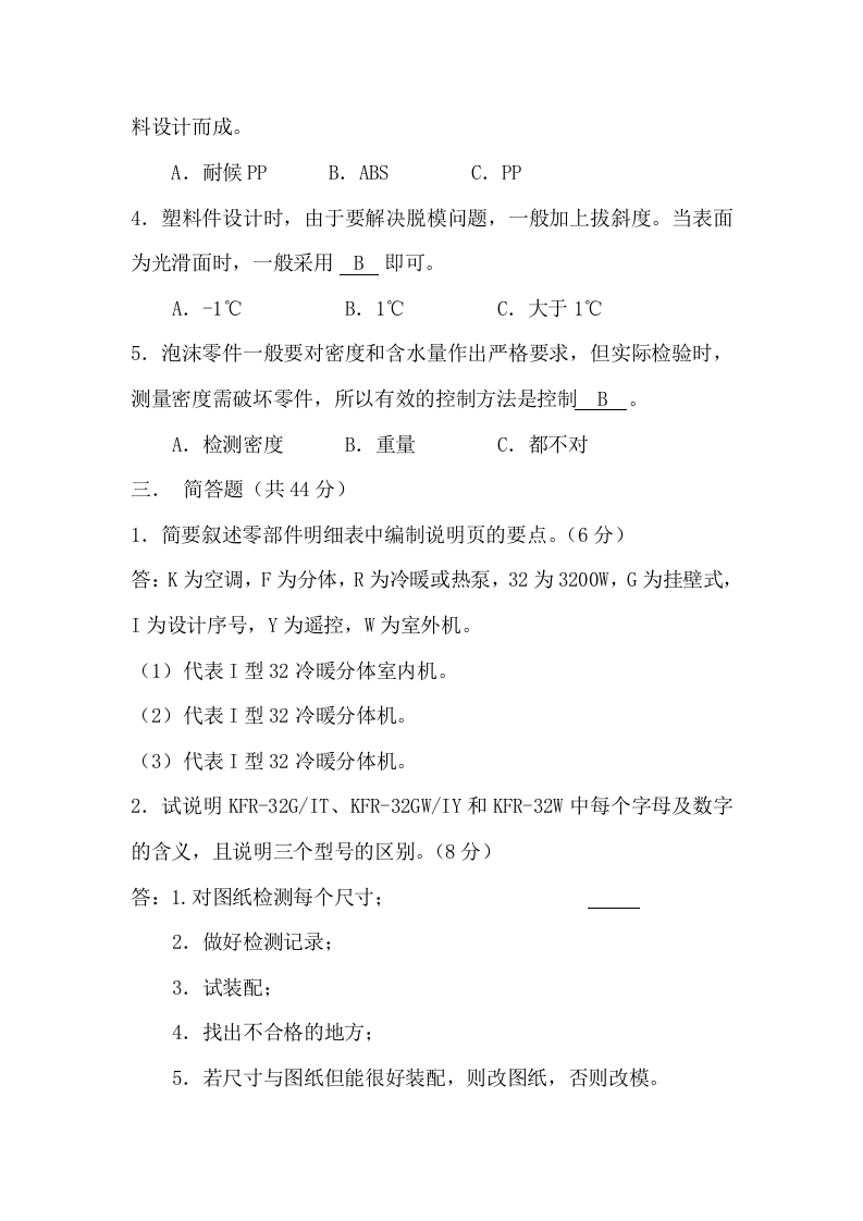 结构设计专业试题姓名部门科室得分一.填空(20分,每题1分)1.国家家用空调器的设计依据国家标准有GB/T7725-1996、GB/4706-1996、GB4706.1-92。2.一台空调,以窗机为例由结构、制冷系统、电控等几大部分。3.美的空调到2000年为止具有窗机,分体机,柜机,除湿机,移动空调,嵌入式空调,座吊两用式空调,MDV空调,空气清新机等类型产品。4.目前我们空调器室外机的外壳一般使用钣金件,内部零部件一般使用的是热镀锌板材料,外部可视部分一般用热镀锌板或冷扎板材料。室外机外部零件必须具备耐候要求。5.目前我们的空调器室内侧一般选用塑料件,常用材料有ABS和PP要求。二.选择题(10分,每题1分)1.塑料零件第一次试模时表面具有收缩痕,一般由A原因造成。A.壁厚不均匀B.材料选用不对C.都不对2.一个塑料电器盒的其中一个电控板安装孔,安装螺钉为ST2.9×8F-H,在设计此电器盒时,相应的安装孔位应为B。A.中2.2B.中2.4C.中2.03.空调室外机出风网罩或外露塑料件要求较高,一般应选用A材