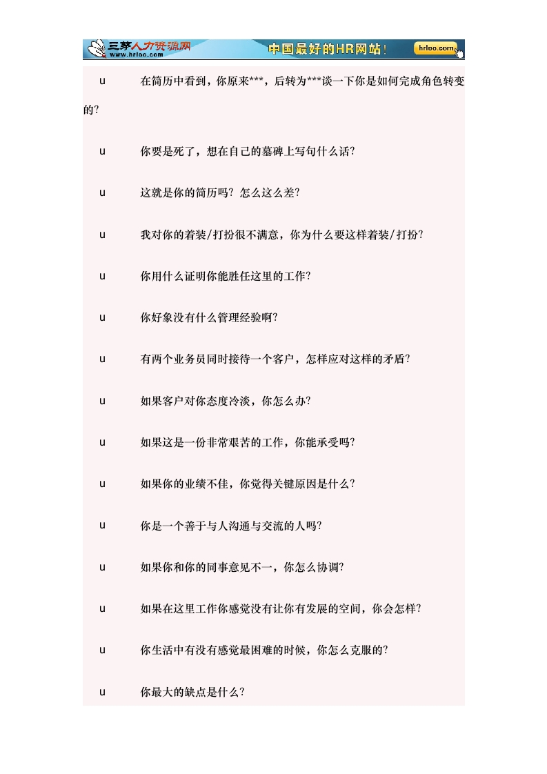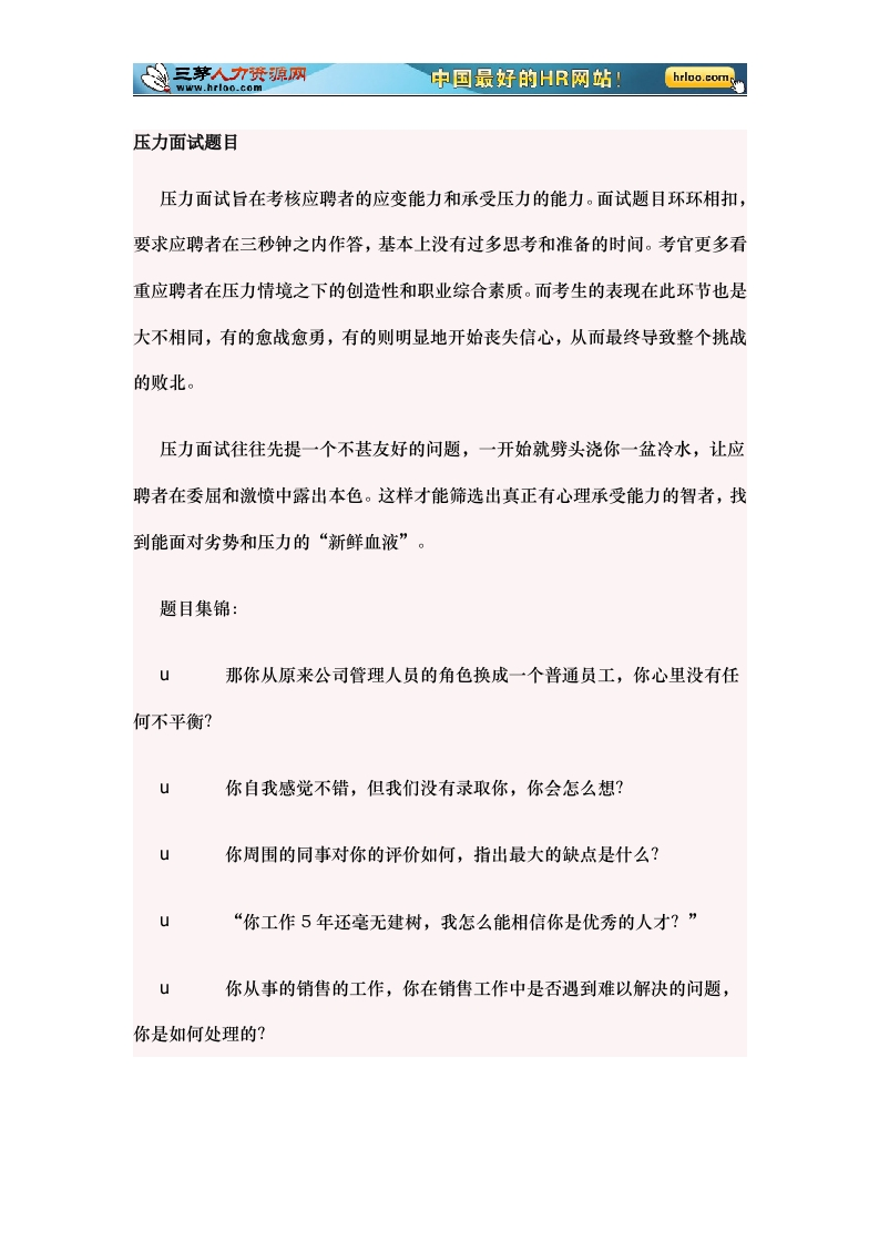 三茅人力资源网中国最好的HR网站!hrloo.comwww.hrloo.com压力面试题目压力面试旨在考核应聘者的应变能力和承受压力的能力。面试题目环环相扣,要求应聘者在三秒钟之内作答,基本上没有过多思考和准备的时间。考官更多看重应聘者在压力情境之下的创造性和职业综合素质。而考生的表现在此环节也是大不相同,有的愈战愈勇,有的则明显地开始丧失信心,从而最终导致整个挑战的败北。压力面试往往先提一个不甚友好的问题,一开始就劈头浇你一盆冷水,让应聘者在委屈和激愤中露出本色。这样才能筛选出真正有心理承受能力的智者,找到能面对劣势和压力的“新鲜血液”。题目集锦:那你从原来公司管理人员的角色换成一个普通员工,你心里没有任何不平衡?你自我感觉不错,但我们没有录取你,你会怎么想?你周围的同事对你的评价如何,指出最大的缺点是什么?“你工作5年还毫无建树,我怎么能相信你是优秀的人才?”你从事的销售的工作,你在销售工作中是否遇到难以解决的问题,你是如何处理的?