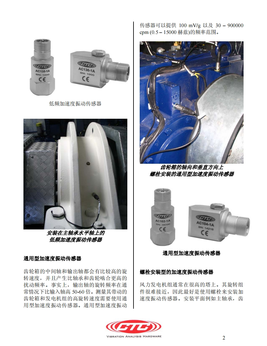 连接技术中心地址:590 Fishers Station DriveVictor,New York 14564免费电话:(800)999-5290电话:(58)924-5900传真:585924-4680风力发电机组的加速度振动传感器再生能源风力发电是一种成长中的干净的可再生能口轴向振动传感帮源。无论是单个机组还是组合机组的风力发口径向振动传感提电场,它们都是目前世界上发展很快的新能源。齿轮箱风力发电机组原理是将风力机械能转化成电发电机能。风力发电的规模可以从500千瓦到6兆瓦。最常用的风力发电机组是水平轴布置。有些是三桨叶,上风向并且带有偏航控制,主要轴承有的则是二桨叶,下风向,自然随风旋转。偶尔你也会看到垂直布置的风力发电机组,带有加速度振动传感器的水平布置的它们也被称为Darrieus(打蛋形)风力发电风力发电机组机组,根据法国发明家而命名。但是这种打蛋形的设计不是很流行,逐渐被性能较好得水平布置的风力发电机组所代替。低频加速度振动传感器风力发电机组和低速电机驱动的风扇,例如主要轴承和转轴的速度大约是30-60pm。这冷却塔,有很多相同之处。风力发电机组基也是齿轮箱输入轴的旋转速度。旋转频率范本上是一个大型低速风扇,但是它不是电能围是30-60cpm(0.5-1.0赫兹)的情况应采驱动,没有将机械能通过减速箱驱动大型低用低频加速度振动传感器。测量的范围包括速风扇,相反的,它提供机械能,通过加速主轴旋转频率,叶片通过频率,主轴承频箱驱动发电机产生电能。这个反向的过程带率,齿轮箱输入轴轴承频率和齿轮啮合频率有很多会产生振动的旋转部件,长时间的损等等。这些低频加速度振动传感器通常可以耗可能会导致最终失效。提供500mV/g以及12-180000cpm(0.2-3000赫兹)的频率范围。·维修费用非常高不可能的工作高度●电能的损失很昂贵●●)VIBRATION ANALYSIS HARDWARE1