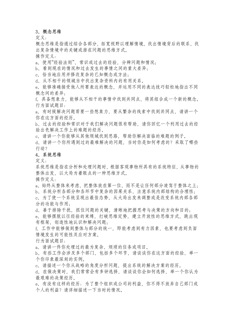 经典行为面试题目(认知能力一)四、认知能力:介绍九个最常用的胜任力及其相应的面试题目1、信息搜索定义:信息搜索是指有强烈的好奇心,为了解更多的人、事物或特殊议题,而花费力气去获得更多的信息。操作定义:a、对问题的形成原因及相关信息很感兴趣,喜欢深入探讨;b、借由探知一系列的问题,针对矛盾之处,不断挖掘真正的解决之道;C、侦查未来可以使用的潜在机会或多样的信息;d、对于获得的信息会亲自去求证是否真实;e、为了了解问题,能够运用系统化的方法来收集信息。行为面试题目:a、请给我讲讲你最近为完成某个项目而遇到的收集信息方面的困难。b、你有没有过由于没能获得有效的信息而作出错误的决定或采取了不当的行为的经历?当时的情况是怎么样的?c、虽然我们每天都会获得大量的信息,但真正有价值的信息却不多,你是如何辨识信息是否有用的?请举一个你在这方面做的不太成功的例子。d、为了核实你所获得的信息是否准确,你都会做哪些工作?请讲一个印象深刻的例子。e、有没有这样的情况:由于你的关系网很广,你能够获得别人得不到的信息?£、我们的每个决定都是建立在获取一定信息的基础上,你是否遇到过找不到相关信息帮你作决定的情况?当时是如何处理的?2、分析思维定义:分析思维是指能够将问题情境细分成较小的部分,或逐步探究问题的内涵的一种分析能力。操作定义:a、按照重要程度设定先后次序;b、有系统地把重要任务分成可处理的小部分;c、找出几个事件的可能原因或几个可能的行为后果;d、预料到会有什么障碍,并事先设想下一步的方案;、利用分析技巧找出多个解决方案,并衡量每个方案的价值。行为面试题目:a、请告诉我你所分析过的最复杂的问题是什么,结果如何?b、请讲一个你所做过的最能反映你的分析能力的项目或任务。c、有没有遇到过这样的情况:当团队面对一个难题束手无策时,你帮助大家理清思路,找到了解决办法,具体讲讲当时的情况。d、请谈谈你最近的工作思路.、当你面对一个复杂的局面时会如何处理?请举一个具体的例子£、请回忆一个最近解决的较难的技术问题,你是怎样解决这个问题的?
