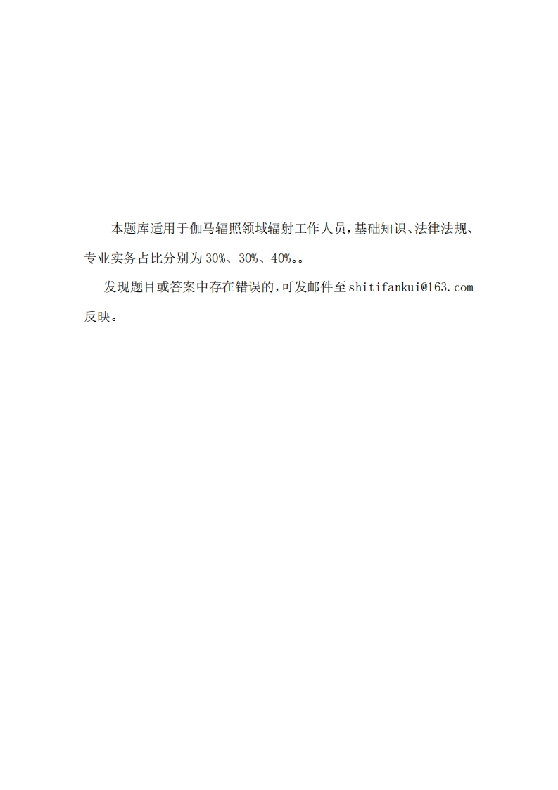辐射安全考核试题348072@abc3个月前发布关注私信3.69MB85页049辐射安全考核试题此内容为付费资源,请付费后查看¥13¥19黄金会员免费钻石会员免费立即购买您当前未登录!建议登陆后购买,可保存购买订单付费资源 第1页 / 共85页 第2页 / 共85页 试读已结束,还剩83页,您可下载完整版后进行离线阅读 THE ENDPPT模板办公模板实用范文物联网设计网站设计网络规划设计 文本预览 辐射安全考核试题伽马辐照(2022年1月版)生态环境部辐射源安全监管司2022年1月30日 查看更多 收起部分 喜欢就支持一下吧收藏