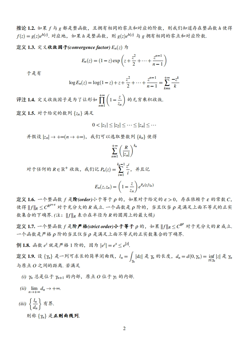 Weierstrass乘积与Mittag-Leffler定理Muke慕可(南开大学数学科学学院)Abstract本文简要介绍了Weierstrass乘积和Mittag-Leffler定理的基础理论,并探讨了它们在复分析中的应用。通过这些工具,我们重新审视并简化了一些传统上较为复杂的问题,如傅里叶分析和含参变量积分等.利用复变函数的方法,我们能够以更高的视角提供简洁的证明和处理方式。具体而言,文章详细讨论了整函数的阶数、无穷乘积的收敛性以及亚纯函数的主要部分构造,并展示了如何用这些理论来解决经典问题,例如Gammai函数的性质、三角函数的因子分解、余元公式以及一些无穷级数和无穷乘积的计算。此外,还介绍了Blaschke定理及其应用,并最终证明了整函数环上的有限生成理想是主理想的结论。1预备知识定理1.1.已知f是无零点的整函数,则存在整函数h满足f=e证明:我们只需要良定义出logf(2)即可.由于f在C上无零点,所以我们知道了是整函数,选取0∈C,我们知道存在wo使得em=f(0),从而我们令Lf(z)=wo+[f(E)sJo f()注意到L)='(f(再注意到是-=efe-are+ter因e-a(←得+同〉=0故我们知道eLr②f(a)在C上是常数,特别地有e-Ly(o)f(z)=e-wof(zo)=1故我们知道er②=f(a),定义logf(z)=Lr()即可.口1