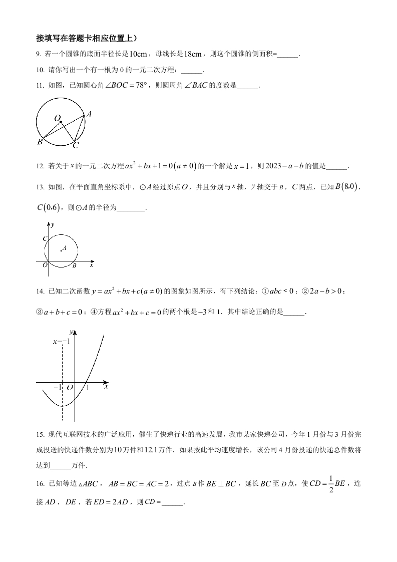 准安市洪泽实验中学2023一2024学年度第一学期期中考试初三数学试卷时间:120分钟满分:150分一、选择题(本大题共有8小题,每小题3分,共24分,在每小题给出的四个选项中,只有一项是符合题目要求的,请将正确选项前的字母代号填涂在答题卡相应位置上)1.下列图形中对称轴最多的是()A.圆B.矩形C.等腰梯形D.八边形2.关于x的方程(a-1)x2+4x-3=0是一元二次方程,则()A.a>1B.a=1C.a≠1D.a≥03.一个不透明的布袋里装有7个只有颜色不同的球,其中3个红球,4个白球,从布袋中随机摸出一个球,摸出的球是红球的概率是()4>B.1C.D.4.一组数据3、2、1、2、2的众数,中位数,方差分别是()A.2,1,0.4B.2,2,0.4C.3,1,2D.2,1,025.将抛物线y=-3x2+1向右平移2个单位,再向上平移1个单位,可得抛物线解析式为()A.y=-3(x+2)2+2B.y=-3(x+2)2C.y=-3(x-2)2+2D.y=-3(x-2)26.下列哪一个函数,其图形与x轴有两个交点()A.y=18(x+83)2+2024B.y=18(x-83)2+2024C.y=-18(x-83)2-2024D.y=-18(x+83)2+20247.某学校规定学生的数学成绩由三部分组成,期末考试成绩占70%,期中考试成绩占20%,平时作业成绩占10%,某人上述三项成绩分别为90分,85分,90分,则他的数学成绩是()A.89分B.88.5分C.85.5分D.84分8.若实数x,y,a满足x+y+a=2,2x+y-a=4,则代数式2y-1的值可以是()A.3B.4C.0D.5二、填空题(本大题共8小小题,每小题3分,共24分.不需要写出解答过程,请把答案直
