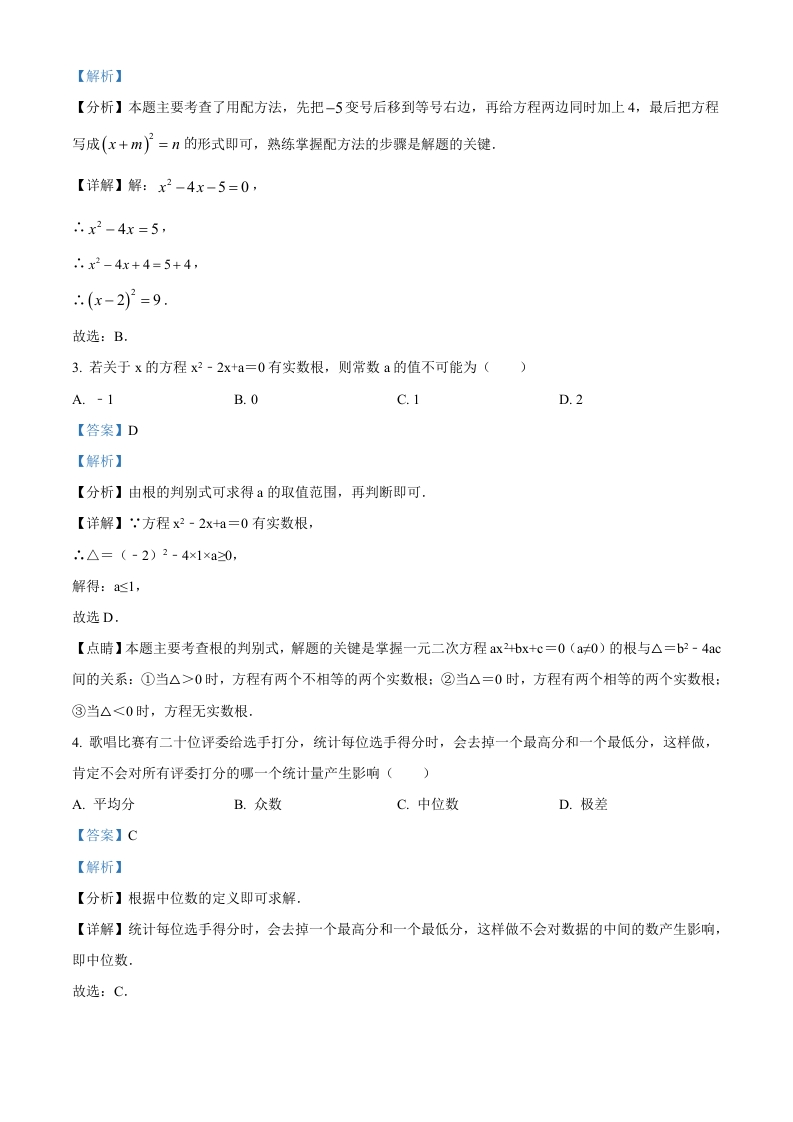 2023一2024学年度第一学期期中学情分析样题九年级数学注意事项:1.本试卷共6页.全卷满分120分.考试时间为120分钟.考生答题全部答在答题纸上,答在本试卷上无效.2.请认真核对监考教师在答题纸上所粘贴条形码的姓名、考试证号是否与本人相符合,再将自己的姓名、准考证号用0.5毫米黑色墨水签字笔填写在答题纸及本试卷上.3.答选择题必须用2B铅笔将答题纸上对应的答案标号涂黑.如需改动,请用橡皮擦干净后,再选涂其他答案.答非选择题必须用0.5毫米黑色墨水签字笔写在答题纸上的指定位置,在其他位置答题一律无效4.作图必须用2B铅笔作答,并请加黑加粗,描写清楚,一、选择题(本大题共6小题,每小题2分,共12分.在每小题所给出的四个选项中,恰有一项是符合题目要求的,请将正确选项前的字母代号填涂在答题卡相应位置上)1.下列选项中,是一元二次方程的是()Ax2-y-2=0B.x-1=0C.x2-2x-5D.x2=4x【答案】D【解析】【分析】本题考查了一元二次方程的定义,能熟记一元二次方程的定义(只含有一个未知数,并且所含未知数的项的最高次数是2的整式方程叫一元二次方程)是解此题的关键。根据一元二次方程的定义逐个判断即可,【详解】解:A.方程x2-y-2=0是二元二次方程,不是一元二次方程,故本选项不符合题意:B.方程x-1=0是分式方程,不是一元二次方程,故本选项不符合愿意:C.x2-2x-5不是方程,不是一元二次方程,故本选项不符合题意:D.方程x2=4x是一元二次方程,故本选项符合题意.故选:D.2.用配方法解方程x2-4x-5=0,下列变形正确的是()A.(x+2)2=9B.(x-2)=9C.(x-22=11D.(x-4)=11【答案】B