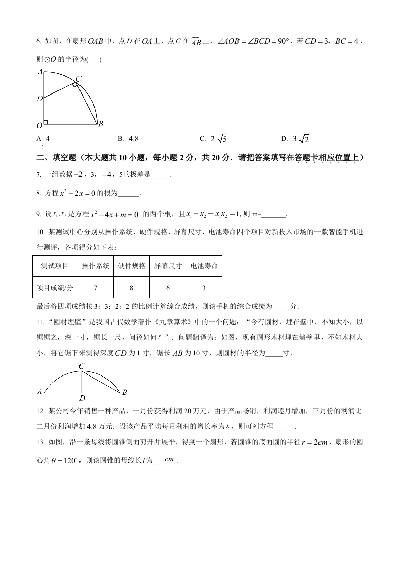 2023一2024学年度第一学期期中学情分析样题九年级数学注意事项:1.本试卷共6页.全卷满分120分.考试时间为120分钟.考生答题全部答在答题纸上,答在本试卷上无效.2.请认真核对监考教师在答题纸上所粘贴条形码的姓名、考试证号是否与本人相符合,再将自己的姓名、准考证号用0.5毫米黑色墨水签字笔填写在答题纸及本试卷上.3.答选择题必须用2B铅笔将答题纸上对应的答案标号涂黑.如需改动,请用橡皮擦干净后,再选涂其他答案.答非选择题必须用0.5毫米黑色墨水签字笔写在答题纸上的指定位置,在其他位置答题一律无效4.作图必须用2B铅笔作答,并请加黑加粗,描写清楚,一、选择题(本大题共6小题,每小题2分,共12分.在每小题所给出的四个选项中,恰有一项是符合题目要求的,请将正确选项前的字母代号填涂在答题卡相应位置上)1.下列选项中,是一元二次方程的是()A.x2-y-2=0B.x-1=0C.x2-2x-5D.x2=4x2.用配方法解方程x2-4x-5=0,下列变形正确的是()A.(x+2)2=9B.(x-2)2=9C.(x-2)2=11D.(x-4)2=113.若关于x的方程x2-2x+a=0有实数根,则常数a的值不可能为()A.-1B.0C.1D.24.歌唱比赛有二十位评委给选手打分,统计每位选手得分时,会去掉一个最高分和一个最低分,这样做,肯定不会对所有评委打分的哪一个统计量产生影响()A.平均分B.众数C.中位数D.极差5.如图,⊙O是△ABC的外接圆,若AB的长等于半径,∠BAC=110°,则∠ABC的度数为()ABA.30°B.40°C.45°D.50°
