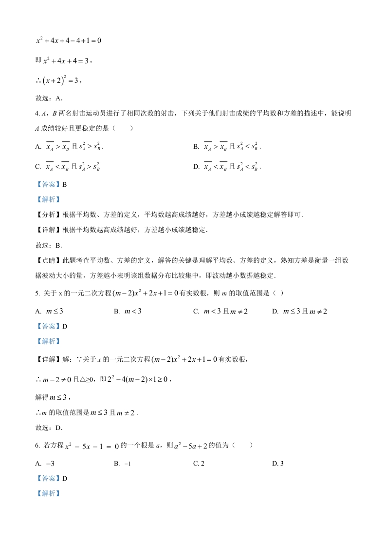2023-2024学年第一学期期中考试试卷初三数学一、填空题(本大题共有10小题,每小题3分,共计30分.)1.下列方程是一元二次方程的是()A.x+2y=1B.x=2x3-3C.x2-2=0D.3x+=1【答案】C【解析】【分析】根据一元二次方程的定义逐个判断即可.【详解】解:A、是二元一次方程,不是一元二次方程,故本选项不符合题意:B、是一元三次方程,不是一元二次方程,故本选项不符合题意:C、是一元二次方程,故本选项符合题意:D、是分式方程,不是整式方程,不是一元二次方程,故本选项不符合题意.故选:C.【点睛】本题考查了一元二次方程的定义,注意:只含有一个未知数,并且所含未知数的项的最高次数是2的整式方程,叫一元二次方程.2.己知样本9.9、10.3、10.3、9.9、10.1,则样本极差是()A.0.4B.16C.0.2D.无法确定【答案】A【解析】【分析】本题主要考查极差的定义,熟练掌握极差的定义求解即可,极差即用最大值减去最小值即可得到答案。【详解】解:由题意得10.3-9.9=0.4,故选A3.用配方法解方程x2+4x+1=0,配方后的方程是()A(x+2)}2=3B.(x-2)=3C.(x-2)=5D.(x+2)2=5【答案】A【解析】【分析】本题考查了配方法解一元二次方程,根据配方法可以解答本题.【详解】解:x2+4x+1=0