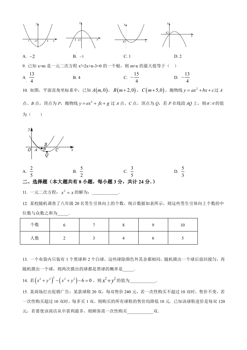 2023-2024学年第一学期期中考试试卷初三数学一、填空题(本大题共有10小题,每小题3分,共计30分.)1.下列方程是一元二次方程的是()A.x+2y=1B.x=2x3-3C.x2-2=0D.3x+=12.己知样本9.9、10.3、10.3、9.9、10.1,则样本极差是()A.0.4B.16C.0.2D.无法确定3.用配方法解方程x2+4x+1=0,配方后的方程是()A.(x+2}=3B.(x-2)2=3C.(x-2)2=5D.(x+2)2=54.A,B两名射击运动员进行了相同次数的射击,下列关于他们射击成绩的平均数和方差的描述中,能说明A成绩较好且更稳定的是()A.x4>xB且S>s6B.x4>xB且ss后D.xA0时,二次函数y=x2+bx+a2-1的图象如下列四个图之一所示.根据图分析,a的值等于()