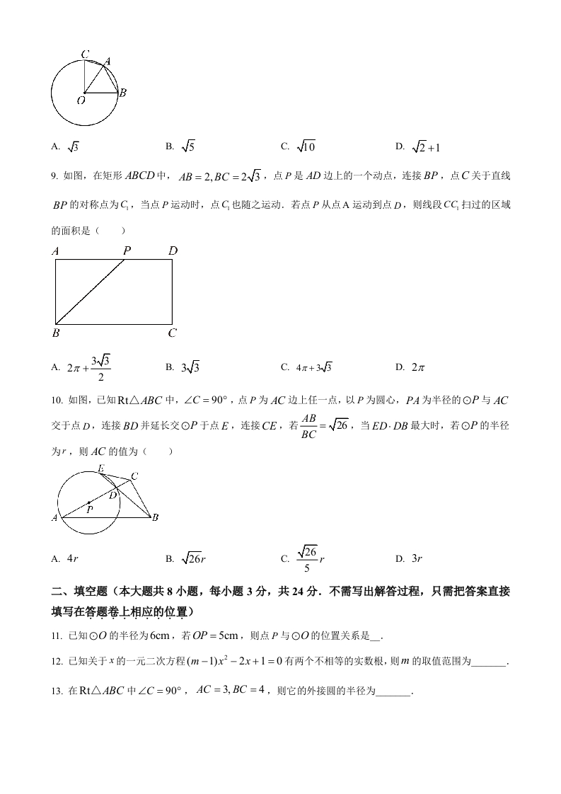 2023年秋学期期中学业质量测试九年级数学考试时间:120分钟满分分值:150分一、选择题(本大题共10小题,每小题3分,共30分.在每小题所给出的四个选项中,只有一项是正确的,请用2B铅笔把答题卡上相应的选项标号涂黑)1.把方程2x(x-)=3x化成一元二次方程的一般形式,则二次项系数、一次项系数、常数项分别是()A.2,1,0B.2,-5,0C.2,-3,-1D.2,5,02.下列一元二次方程中,无实数根的是(A.x2+3x+2=0B.x2-2x-3=0C.x2+2x+3=0D.x2-2x+1=03.如图,一块直角三角板的30°角的顶点P落在⊙O上,两边分别交⊙O于A4,B两点,连结AO,BO,则∠AOB的度数是()A.30°B.60°C.80°D.90°4.关于x的方程(3-a)x2-2x+a2-9=0有根是0,则a的值是()A.3或-3B.1C.3D.-35.如图,己知⊙0过正方形ABCD的顶点A、B,且与CD边相切,若正方形的边长为4,则⊙0的半径为()A.B.5D.4C.55-26.下列说法中,正确的是()A.长度相等的弧是等弧B.三点确定一个圆C.平分弦的直径垂直于这条弦D.弦的垂直平分线必经过圆心7.正多边形的一个内角的度数不可能是(A.135°B.80°C.144°D.150°8.如图,点A,B,C在⊙O上,∠BOC=90°,AB=22,AC=2,⊙0的半径为()
