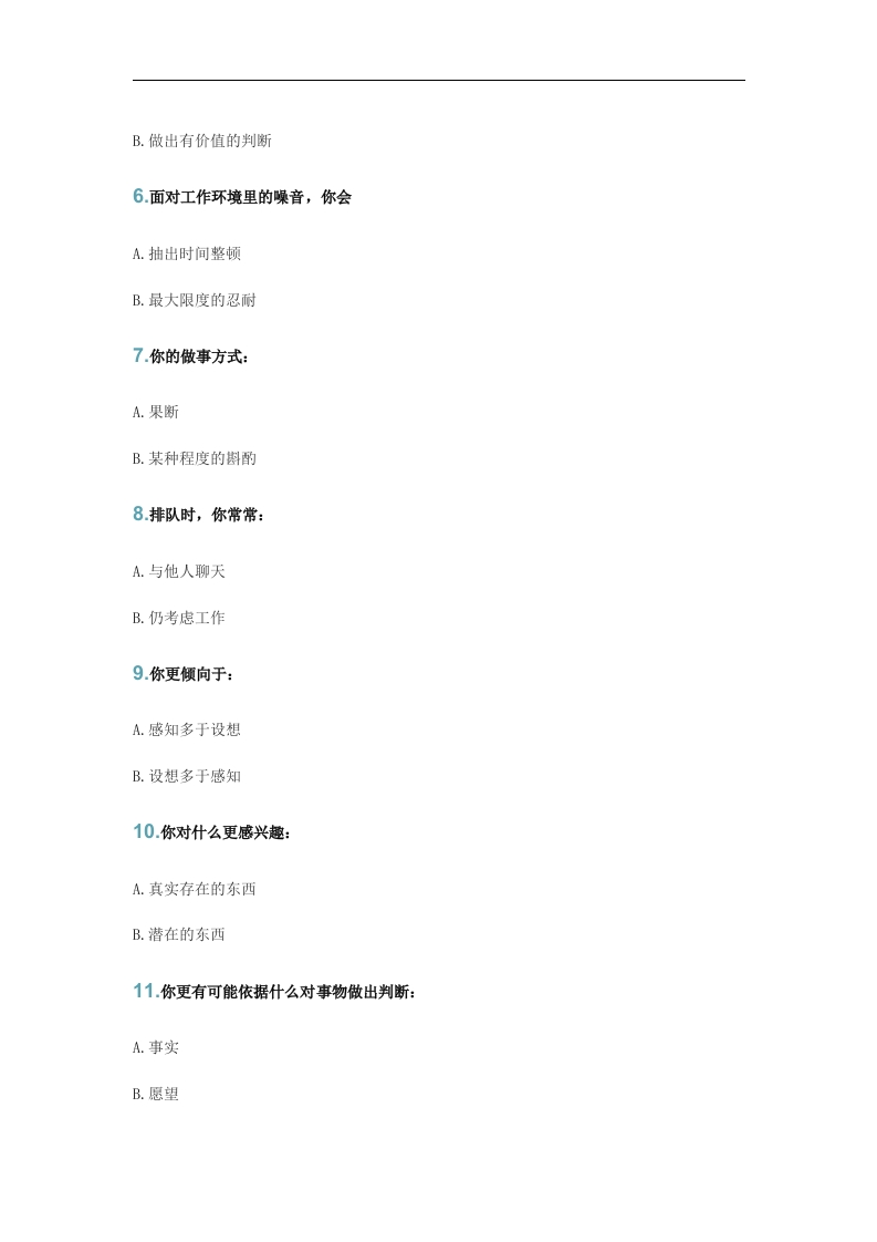 凯尔西气质类型测试348072@abc3个月前发布关注私信0.24MB77页037凯尔西气质类型测试此内容为付费资源,请付费后查看¥11¥31黄金会员免费钻石会员免费立即购买您当前未登录!建议登陆后购买,可保存购买订单付费资源 第1页 / 共77页 第2页 / 共77页 试读已结束,还剩75页,您可下载完整版后进行离线阅读 THE END初中教育学习资源小学教育教育学类高中教育高考真题 文本预览 凯尔西气质类型测试别太多,下手的时候别哆嗦,想选什么就选什么,又不是考试卷子,也不打分儿1.电话铃响的时候,你会:A.马上第一个去接B.希望别人去接2.你更倾向于:A.迅速做出反应B.时常自我反省3.对你来说哪种情况更糟糕:A.想入非非B.循规蹈矩4.同别人在一起,你通常:A.自我而不随和B.随和而不自我5.哪种事更使你感到惬意:A.做出权威判断 查看更多 收起部分 喜欢就支持一下吧收藏