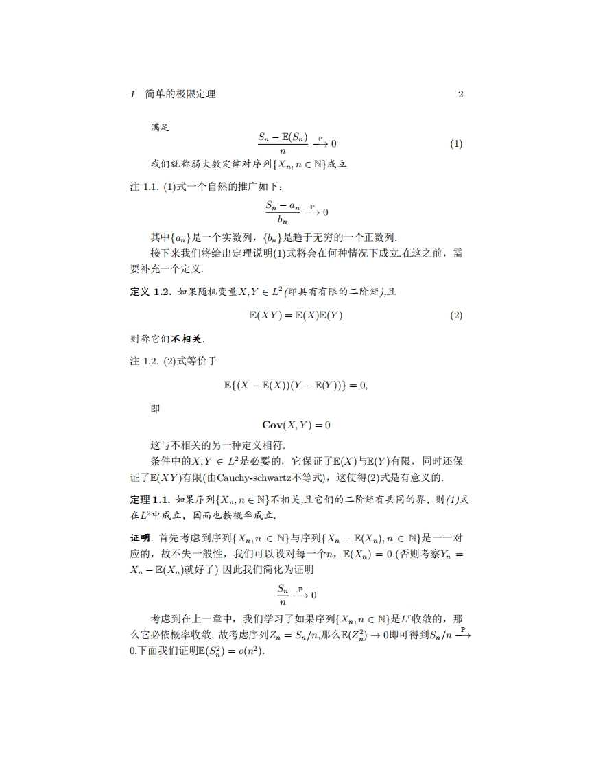 概率论讨论班(第⑩次)大数定律桶寄001戴沄汐2022年5月24日目录1简单的极限定理11.1服从弱大数定律的随机变量序列.··11.2服从强大数定律的随机变量序列.···。。。2弱大数定律62.1 Khinchin弱大数定律.....·.622完全独立随机变量的弱大数定律.················3一个重要不等式101简单的极限定理1.1服从弱大数定律的随机变量序列首先要说明的是,所谓“大数定律”并不是某一条定律,而是一类问题,用于刻画一列随机变量的收敛情况。本节介绍服从弱大数定律的随机变量序列。定义1.1.如果随机变量序列{X,n∈N}的部分和-2x1
