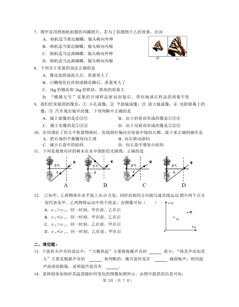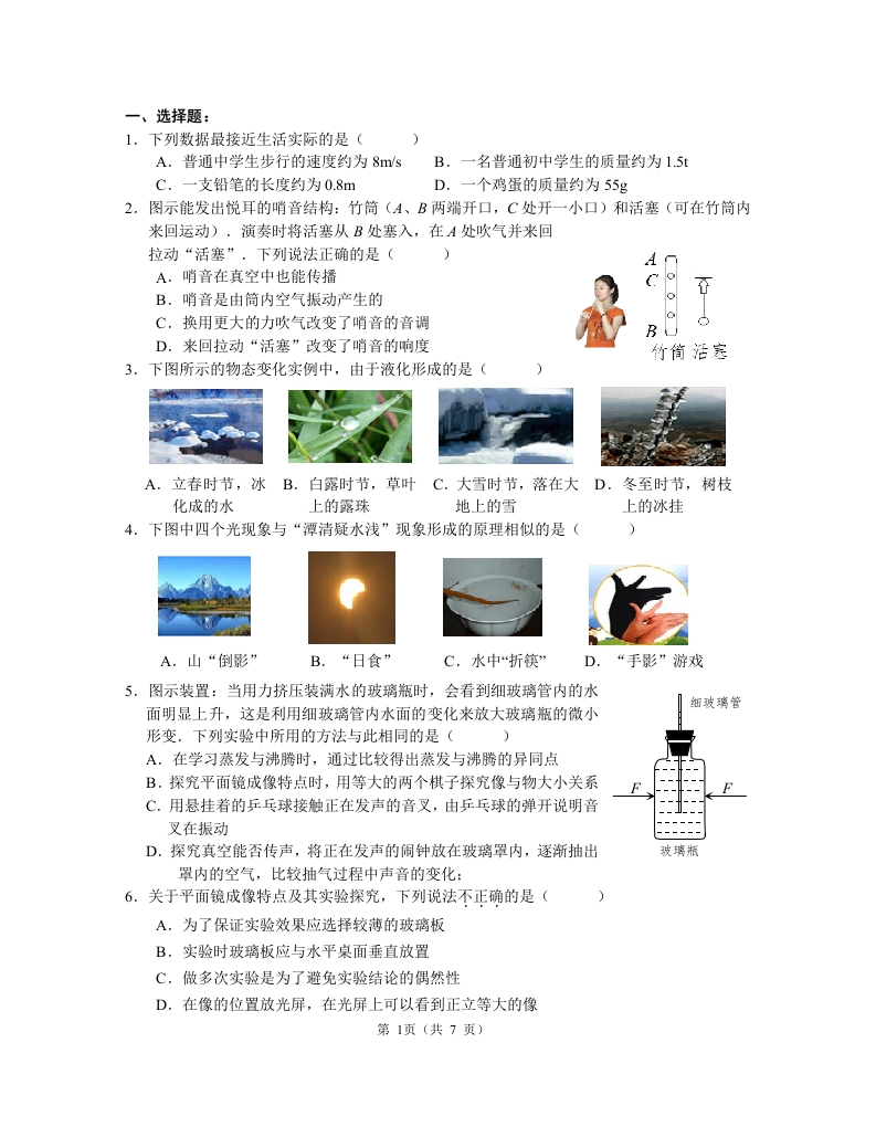 一、选择题:1.下列数据最接近生活实际的是(A.普通中学生步行的速度约为8msB.一名普通初中学生的质量约为1.51C.一支铅笔的长度约为0.8mD.一个鸡蛋的质量约为55g2.图示能发出悦耳的哨音结构:竹筒(A、B两端开口,C处开一小口)和活塞(可在竹筒内来回运动),演奏时将活塞从B处塞入,在A处吹气并来回拉动“活塞”,下列说法正确的是(AA.哨音在真空中也能传播B.哨音是由筒内空气振动产生的C.换用更大的力吹气改变了哨音的音调BD.来回拉动“活塞”改变了哨音的响度竹简活塞3.下图所示的物态变化实例中,由于液化形成的是(A.立春时节,冰B.白露时节,草叶C.大雪时节,落在大D.冬至时节,树枝化成的水上的露珠地上的雪上的冰挂4.下图中四个光现象与“潭清疑水浅”现象形成的原理相似的是()A.山“倒影”B.“日食”C.水中“折筷”D.“手影”游戏5.图示装置:当用力挤压装满水的玻璃瓶时,会看到细玻璃管内的水细玻璃管面明显上升,这是利用细玻璃管内水面的变化来放大玻璃瓶的微小形变.下列实验中所用的方法与此相同的是(A.在学习蒸发与沸腾时,通过比较得出蒸发与沸腾的异同点B.探究平面镜成像特点时,用等大的两个棋子探究像与物大小关系FC.用悬挂着的乒乓球接触正在发声的音叉,由乒乓球的弹开说明音叉在振动----D.探究真空能香传声,将正在发声的闹钟放在玻璃罩内,逐渐抽出玻璃瓶罩内的空气,比较抽气过程中声音的变化:6.关于平面镜成像特点及其实验探究,下列说法不正确的是(A,为了保证实验效果应选择较薄的玻璃板B.实验时玻璃板应与水平桌面垂直放置C.做多次实验是为了避免实验结论的偶然性D.在像的位置放光屏,在光屏上可以看到正立等大的像第1页〔共7页)