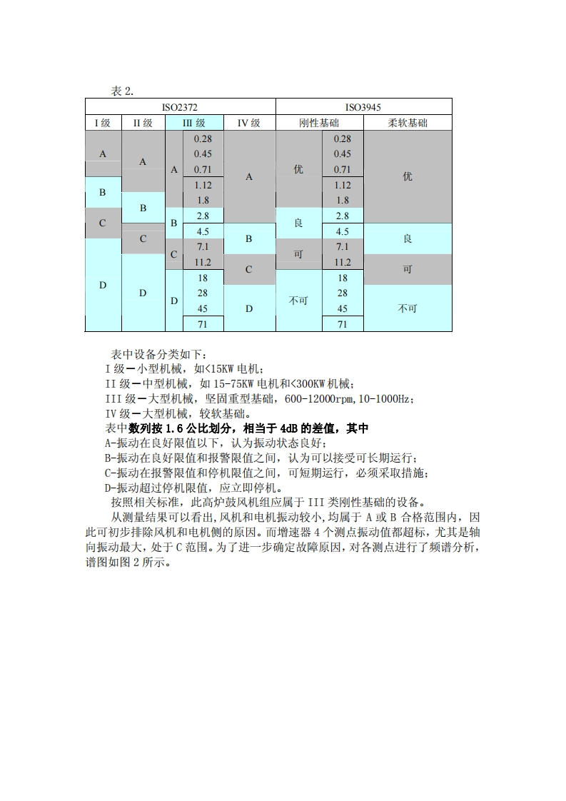 450m3高炉电动风机轴向振动大故障两例唐钢炼铁厂康晓村(063020)摘要本文针对高炉电动风机振动的实际情况,运用Commtest VB3000和Ascent Level2振动测量与分析工具,较为详细地讨论了轴向振动的故障原因和诊断方法。关键词高炉风机振动故障频谱分析唐钢炼铁厂银钢区4号450m3高炉电动鼓风机组采用西安交大赛尔机泵成套设备有限责任公司产品D2000-340/98全可控涡三元离心式鼓风机,转速6000rpm,风量2000m/min,上海电机厂YGF900-4异步电机,1488rpm,6800KW,重庆江阴产5511型增速器,速比1:4.0323。一、故障一2004年11月18日,运行人员反映机组振动增大,尤其是增速器侧振动剧烈。随即对此机组进行诊断性测振。使用VB3000振动测试分析仪,测振点布置如图1,测振结果如表1所示:4⑥电机⑧⑦②风机☐⑤增速器图1.振动测点布置图表1.振动值为振动速度,单位为mm/sms振动方向1号测点2号测点3号测点4号测点5号测点6号测点7号测点8号测点水平1.11.63.62.94.54.51.61.4垂直0.83.04.37.36.65.71.41.4轴向1.14.111.910.811.013.22.02.7相关振动速度标准如表2所示。
