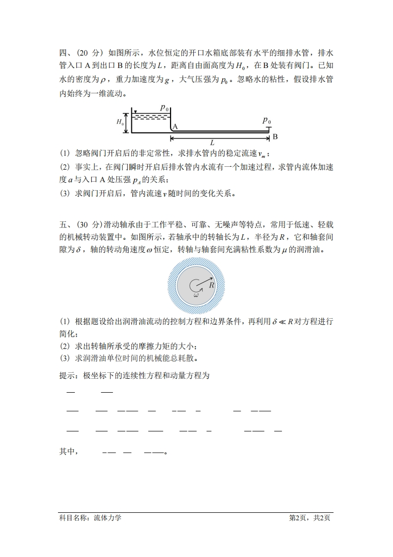 中国科学院大学2020年招收攻读硕士学位研究生入学统一考试试题科目名称:流体力学考生须知:1.本试卷满分为150分,全部考试时间总计180分钟。2.所有答案必须写在答题纸上,写在试题纸上或草稿纸上一律无效。一、判断题(共20分,每小题4分,正确的打“√”,错误的打“×”)1.在重力场中静止流体的流场一定是正压的。2.流线和迹线只能在定常流场中重合。3.流体的动力粘性系数随温度的升高而降低。4.流线型物体绕流也可能出现边界层分离。5.不可压缩湍流的时均连续方程和动量方程构成封闭方程组。二、简答题(共60分,每小题12分)》1.点涡流场中,流体质点绕涡心做匀速圆周运动,且速度大小与该点到涡心的距离成反比。请问除涡心外的流场各处是否有旋?并简述理由。2.我们在分析运动物体在流体中所受阻力时,有些情况下假设阻力大小直接与速度成正比,另一些情况下假设阻力大小与速度的平方成正比。请分别举例说明它们适用于什么流动情况?为什么?3.液滴撞击液面的速度超过某临界值时,将形成皇冠状溅射结构。已知临界速度'。与液滴的半径a、液体密度p和表面张力系数σ相关。请给出表面张力系数的量纲,并用量纲分析方法求的表达式(可保留一个比例系数)。4.某人想测量超声速气流的马赫数,他先用皮托管测出总压和静压,再根据等熵流动关系式算出气流的马赫数,请分析他的做法是否可行。5.海陆风常出现于近海和海岸地区,日间由海洋吹向陆地,夜间由陆地吹向海洋,试解释其原理。三、(20分)已知某流动的拉格朗日描述为:x ae'+be,其中a和b为拉y=ae'-be-格朗日变数。(1)求1=0时刻,过点(4,2)的流线方程:(2)求1=0时刻经过点(4,2)的流体质点的迹线方程:(3)请判断该流动是否定常?是否可压缩?是否有旋?科目名称:流体力学第1页,共2页