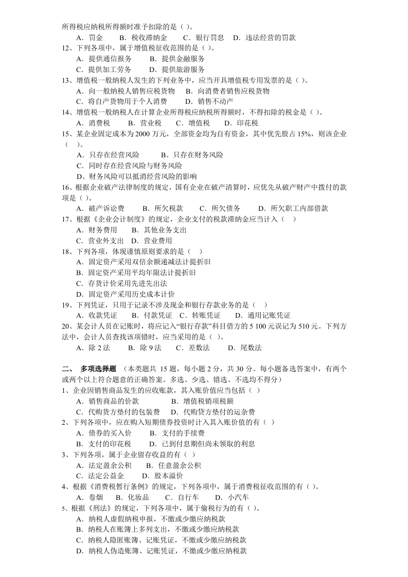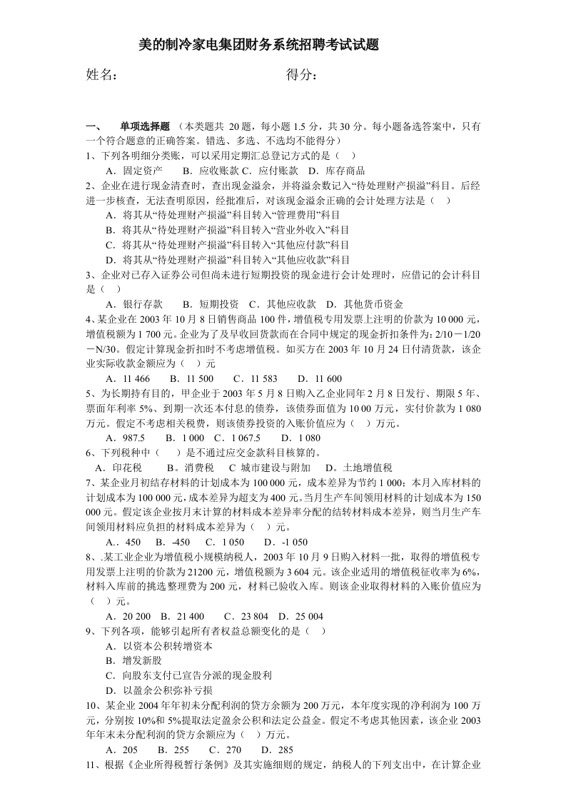 美的制冷家电集团财务系统招聘考试试题姓名:得分:一、单项选择题(本类题共20题,每小题1.5分,共30分。每小题备选答案中,只有一个符合题意的正确答案。错选、多选、不选均不能得分)1、下列各明细分类账,可以采用定期汇总登记方式的是()A.固定资产B.应收账款C.应付账款D.库存商品2、企业在进行现金清查时,查出现金溢余,并将溢余数记入“待处理财产损溢”科目。后经进一步核查,无法查明原因,经批准后,对该现金溢余正确的会计处理方法是()A.将其从“待处理财产损溢”科目转入“管理费用科目B.将其从“待处理财产损溢科目转入“营业外收入”科目C.将其从“待处理财产损溢”科目转入“其他应付款”科目D.将其从“待处理财产损溢”科目转入“其他应收款”科目3、企业对已存入证券公司但尚未进行短期投资的现金进行会计处理时,应借记的会计科目是()A.银行存款B.短期投资C.其他应收款D.其他货币资金4、某企业在2003年10月8日销售商品100件,增值税专用发票上注明的价款为10000元,增值税额为1700元。企业为了及早收回货款而在合同中规定的现金折扣条件为:210一120一N/30。假定计算现金折扣时不考虑增值税。如买方在2003年10月24日付清货款,该企业实际收款金额应为()元A.11466B.11500C.11583D.116005、为长期持有目的,甲企业于2003年5月8日购入乙企业同年2月8日发行、期限5年、票面年利率5%、到期一次还本付息的债券,该债券面值为1000万元,实付价款为1080万元。假定不考虑相关税费,则该债券投资的入账价值应为()万元A.987.5B.1000C.1067.5D.10806、下列税种中()是不通过应交金款科目核算的。A.印花税B。消费税C城市建设与附加D。土地增值税7、某企业月初结存材料的计划成本为100000元,成本差异为节约1000:本月入库材料的计划成本为100000元,成本差异为超支为400元.当月生产车间领用材料的计划成本为150000元。假定该企业按月末计算的材料成本差异率分配的结转材料成本差异,则当月生产车间领用材料应负担的材料成本差异为()元。A.450B.450C.1050D.-10508、.某工业企业为增值税小规模纳税人,2003年10月9日购入材料一批,取得的增值税专用发票上注明的价款为21200元,增值税额为3604元。该企业适用的增值税征收率为6%,材料入库前的挑选整理费为200元,材料己验收入库。则该企业取得材料的入账价值应为()元A.20200B.21400C.23804D.250049、下列各项,能够引起所有者权益总额变化的是()A.以资本公积转增资本B.增发新股C.向股东支付已宣告分派的现金股利D.以盈余公积弥补亏损10、某企业2004年年初未分配利润的贷方余额为200万元,本年度实现的净利润为100万元,分别按10%和5%提取法定盈余公积和法定公益金。假定不考虑其他因素,该企业2003年年末未分配利润的贷方余额应为()万元。A.205B.255C.270D.28511、根据《企业所得税暂行条例》及其实施细则的规定,纳税人的下列支出中,在计算企业