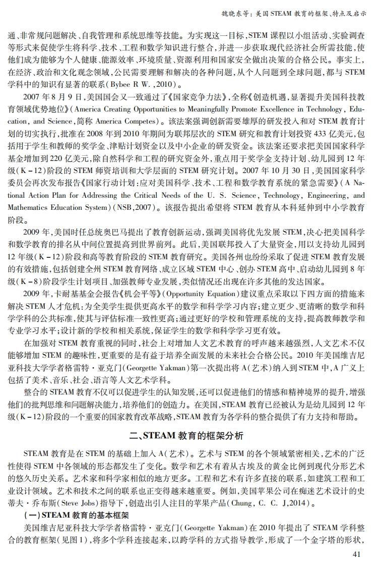 JOURNAL OF EAST CHINA NORMAL UNNERSITYEducational Sciences No.4,2017D0I:10.16382/j.cnki.1000-5560.2017.04.004美国STEAM教育的框架、特点及启示魏晓东于冰于海波(教育部人文社会科学重点研究基地东北师范大学中国农村教育发展研究院,吉林长春130024)摘要:近年来,美国在推进基础教有改革的过程中,不断提高对STEAM教有的重视程度,甚至将其视为一种国家战略。通过STEAM教有,可以培养学生以学科整合的方式认识世界,运用跨学科的思维解决现实问题,提升他们的逻辑思维能力和问题解决能力,使其成为具有SEAM素养的高质量人才。STEAM教有在世界范围内迅速展开,必将推动基础教有的重大变革。梳理STEAM教有的产生背景,分析STEAM教有的框架,总结STEAM教有的特点可以为我国基础教有改革带来有益启示。关键词:STEAM教有;项目学习;基础教有创新是一个国家和民族永葆生机的不竭动力。目前,一种培养创新型人才的教育新范式一STEAM教育,逐渐走进人们的视野,即将成为知识经济时代的一种全球性教育战略。新媒体联盟《地平线报告》(2015基础教育版)认为未来1至2年,STEAM教育将成为世界基础教育发展的新趋势。STEAM是科学(Science)、技术(Technology)、工程(Engineering)、艺术(Arts)和数学(Mathematics)的简称,它是由美国政府提出的STEM教育战略衍生而来,最初只有科学、技术、工程和数学四门,后来加入艺术,成为包容性更强的跨学科综合教育。SEAM教育旨在打破学科领域的界限,倡导基于项目的学习方式,强调体验性和实践性,是一种新的教育理念和学习方法。STEAM教育发源于美国,自20世纪90年代以后,逐渐风靡韩国、英国等国家和地区。一、STEAM教育的产生背景早在l986年,美国国家科学委员会(National Science Board,简称NSB)就发布了报告《本科的科学、数学和工程教育》(Undergraduate Science,Mathematics and Engineering Education),这被视为提倡STEM教育的开端(NSB,1986)。2OO5年l0月,由美国国家科学院(National Academy of Science,简称NAS)、国家工程院(NationalAcademy of Engineering,简称NAE)、医学科学院(Institute of Medicine,简称IOM)和国家研究委员会(National Research Center,简称NRC)联合向美国国会呈上报告《驾驭风暴:美国动员起来为更加辉煌Rising Above the Gathering Storm:Energizing and Employing America for a Brighter Economic Fu-tur©)。该报告是针对美国21世纪科技教育发展的战略性报告,提出了促进STEM教育的相关建议:一是,到2010年,初、高中数学及科学课程的数量要达到现在的四倍;二是,每年招聘1万名新的数学和科学教师;三是,提高25万名数学和科学在职教师的教学技能;四是,增加STEM领域学士学位授予数量,并对研究生阶段和职业生涯早期阶段的STEM领域研究给予支持。报告中强调学生需掌握有效沟*基金项目:教育部人文社科重点研究基地重大项目2016年度课题“农村学校办学形态与品质提升”(16JD880015)。40