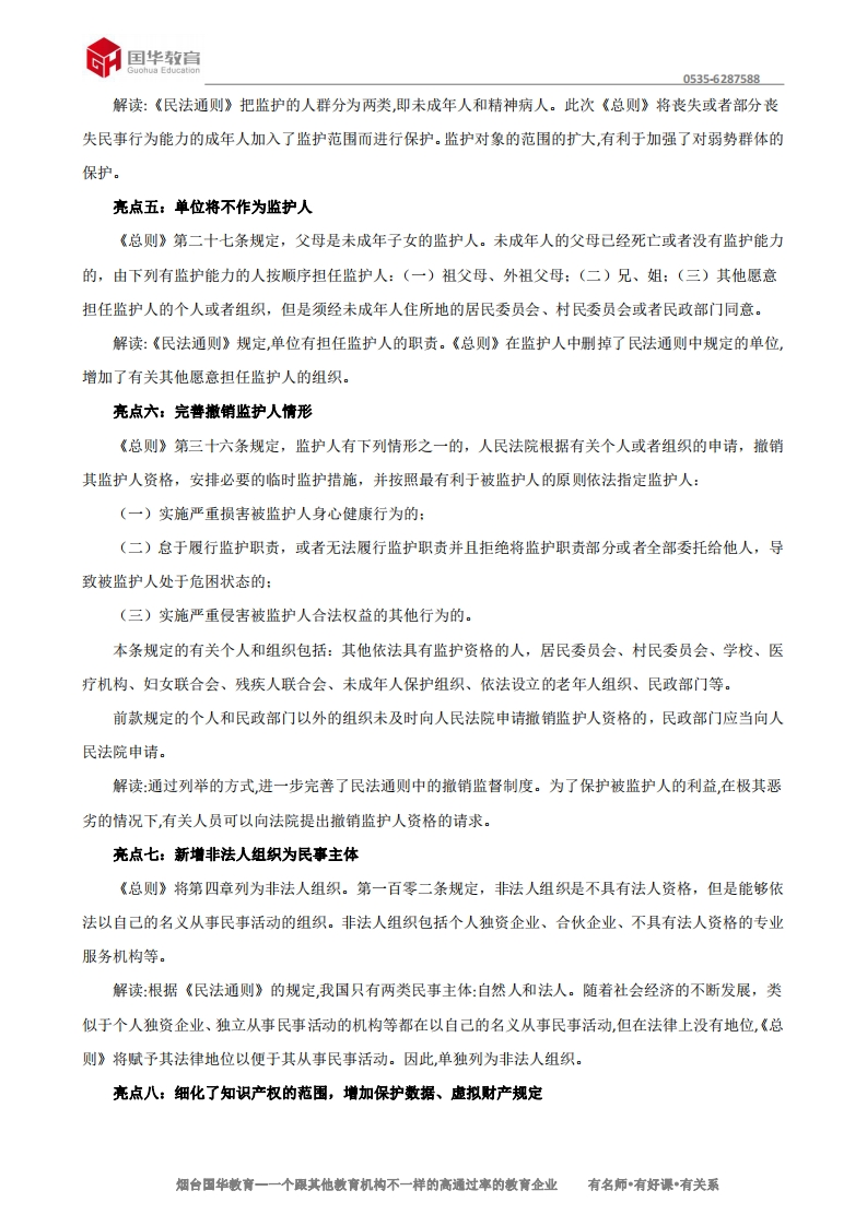 国华数自0535-6287588民法总则十大亮点解读《中华人民共和国民法总则》(以下简称《总则》)己于2017年3月15日第十二届全国人民代表大会第五次会议通过,并将于2017年10月1日起施行。本法分为十一章,共二百零六条。现对《总则》中的十大亮点进行解读。亮点一:明确胎儿利益保护《总则》第十六条规定,涉及遗产继承、接受赠与等胎儿利益保护的,胎儿视为具有民事权利能力。但是胎儿娩出时为死体的,其民事权利能力自始不存在。解读:《总则》第十三条的规定,自然人从出生时起到死亡时止,具有民事权利能力,依法享有民事权利,承担民事义务。自然人享有民事权利能力的时间起点为出生时,终止时间为死亡时。由于胎儿尚未出生而成为独立的个体,因此,不具有民事权利能力。《总则》出于对胎儿权益进行保护的目的,列举了在为“遗腹子”保留必要的继承份额的制度及接受赠与的权利等方面,胎儿被视为具有民事权利能力。亮点二:以年龄来划界的限制民事行为能力人的年龄下调为8周岁《总则》第十九条规定,八周岁以上的未成年人为限制民事行为能力人,实施民事法律行为由其法定代理人代理或者经其法定代理人同意、追认,但是可以独立实施纯获利益的民事法律行为或者与其年龄、智力相适应的民事法律行为。解读:与《民法通则》对比发现限制民事行为能力人年龄下限标准由十周岁下调到八周岁。随着社会经济的发展、生活教育水平的提高,现在儿童的心智水平和发育状况远远高于以前同龄阶段儿童的水平。此阶段的未成年人己经可以独立实施某些民事行为,并且能对自己的一些行为作出独立判断。年龄下限的下调,有利于尊重这一阶段未成年人的自主意识,保护其合法权益。亮点三:再次强调抚养赡养义务《总则》第二十六条规定,父母对未成年子女负有抚养、教育和保护的义务。成年子女对父母负有赡养、扶助和保护的义务。解读:上述规定在未成年人保护法、反家庭暴力法等相关法律中都有规定,此次《总则》中再一次强调了父母对未成年子女的抚养教育保护义务,成年子女对父母的赡养扶助保护义务,以强调作为父母和成年子女的家庭责任,弘扬我国的传统美德。亮点四:扩大监护对象范围《总则》第二十一条规定,不能辨认自己行为的成年人为无民事行为能力人,由其法定代理人代理实施民事法律行为。第二十二条规定,不能完全辨认自己行为的成年人为限制民事行为能力人,实施民事法律行为由其法定代理人代理或者经其法定代理人同意、追认,但是可以独立实施纯获利益的民事法律行为或者与其智力、精神健康状况相适应的民事法律行为。烟台国华数育一一个限其他教育机构不一样的高通过事的数育企业有名师·有好课·有关系