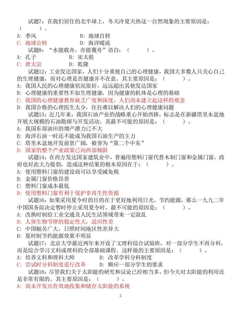 南方电网校园招聘专项题库选择题155道试题1:虎被列为国际资源和自然保护联盟宣布为濒危动物,并被列为一类保护动物。世界野生动物基金会也为保护野生虎开展了许多活动。人们之所以对老虎有如此高的热情,其主要原因是:()。A:老虎具有很强的观赏价值,人们特别喜爱它B:老虎的灭绝会破坏自然界的生态平衡C:艺术家们特别青睐老虎的威猛雄姿D:老虎全身如皮、骨、胆、须等都具有很高的装饰和药用价值试题2:航天飞机以很高的速度绕地球飞行,宇航员能够离开航天飞机在太空中行走而不被甩掉的原因是:()。A:宇航员身上都有一根绳子与航天飞机相连B:他们身上都背着一个火箭助推器使他们的速度与航天飞机相同C:太空中没有阻力,他们在太空中仍然保持着与航天飞机相同的速度D:此种传闻不太可靠,人不可能在太空中行走试题3:某些杂志上介绍,如果人们睡觉的时候选择南北方向比选择东西方向更有益于健康,其原因是:()。A:空气的流动是顺着南北方向B:南北方向正是地磁方向,顺着这一方向可以享受磁疗C:这是个别人的经验之说,并不具有普遍意义D:这是一种迷信的说法试题4:信仰宗教是个人的自由,但近年来,在我国有些地方,少数人利用人们对宗教的虔诚大搞封建迷信活动,有的甚至披上了合法的外衣。产生这一现象的主要原因是:()。A:宗教迷信往往能解决人们的一些实际问题B:文化的机荒使人们见不择食C:宗教迷信有一定的科学依据,只不过我们现在还不能准确地解释D:各级组织及管理部门对迷信缺乏正确的引导试题5:在著名的科学家中,男性所占的比例大大超过女性,其主要原因是:()。A:男性的智商比女性高B:男性比女性追求成功的动机更强,机会更多C:传统教育思想的影响D:男女社会地位差距悬殊所至试题6:“千年虫”问题指:(A:计算机系统的时间变换问题B:2000年黑客同时入侵C:计算机的一种病毒D:1000年发作一次的病毒