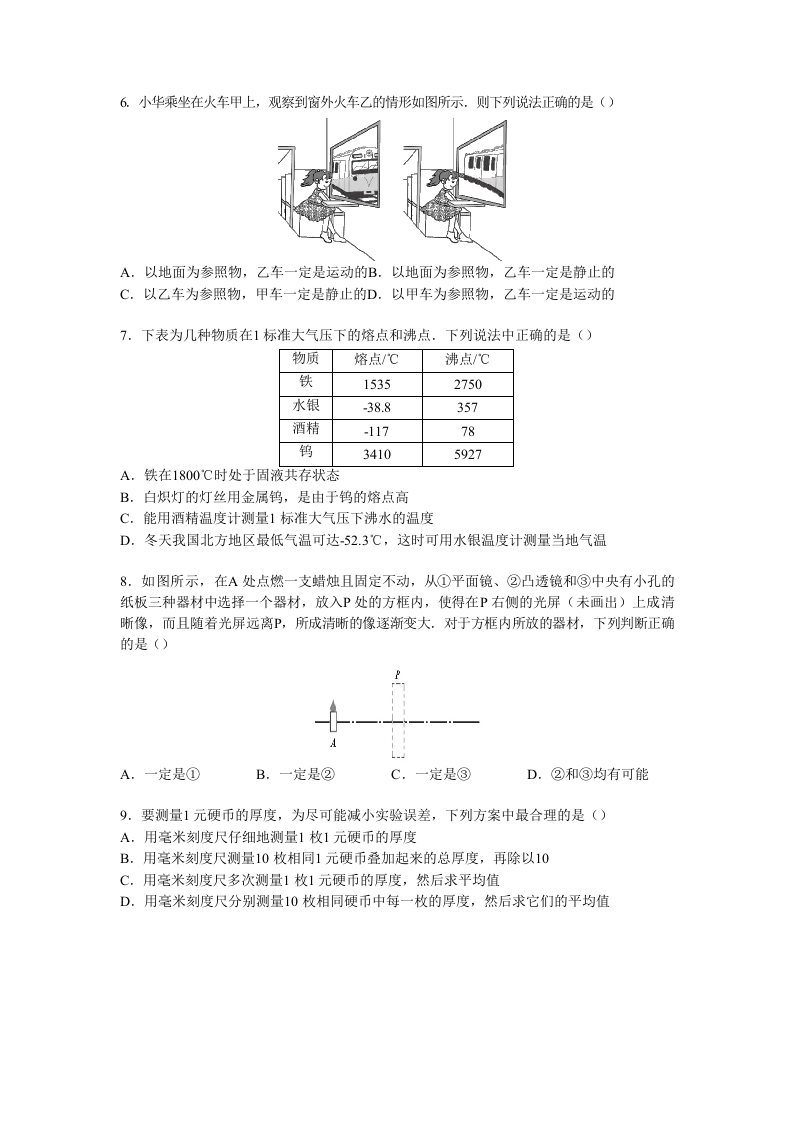 建邺区2021八上物理期末试卷一、选择题(本题共12小题,每小题2分,共24分.每小题只有一个选项正确)1.下列说法中合理的是()A.正常人耳听不到3Hz的声音B.普通人的洗澡水温度约为60℃C.一本物理教科书的宽度约为18dmD.人正常步行的速度约为5m/s2.以下自然现象在形成过程中需要吸收热量的是()A.初春,河流中冰雪消融B.仲夏,草叶间露珠晶莹C.深秋,枝头上挂满白霜D.寒冬,草叶上冰挂别透分丙3.如图所示,有关声现象实验的说法正确的是(A.甲图中通过观察纸屑跳动的幅度可以探究“音调与频率的关系”B.乙图中无风时,正在发声的扬声器旁的烛焰晃动,说明声波具有能量C.丙图中通过逐渐抽取玻璃罩中的空气可以直接得出真空不能传声D.丁图中将发声的音叉插入水中观察到音叉周围溅起许多水花,说明液体可以传声4.一位摄影爱好者早上在河边照相,观察到岸边的建筑物在水面上形成的影像甲和乙(如图所示),两小时后他又回到原位置观察,影像甲和乙的大小变化情况是()建筑物A.都变B.都不变C.甲变,乙不变D.甲不变,乙变5.老师把一块平面镜CD放置在桌面上,B处的甲同学通过平面镜看到了A处的乙同学(如图所示).这一反射现象中的反射角是(NA.∠1B.∠2C.∠3D.∠4