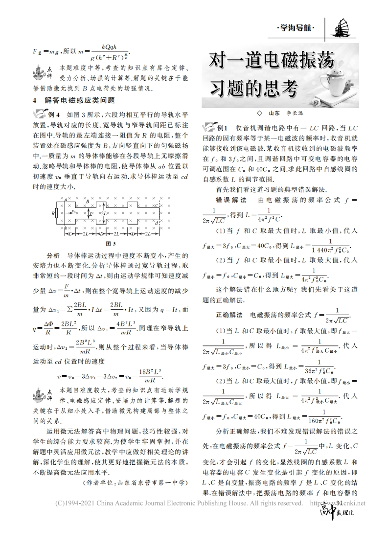 学海导航·MgMgC.6π2a(2-1)D.8r(b-a)高中助建解题中元治的园分析截取均匀绳圈上长度非常小的微元,设对应的圆心角为△9.则对应的质量△m=M,对应的△◇山东李衡诚重力△mg=一·Mg,设左右两边绳圈对其的拉力均2高中阶段部分物理习题创设的情境较为特殊,不为F,则其合力指向圆心,由力的合成法则可知,合符合相关物理定理的适用条件,无法直接运用相关规力F=2F1n兰,又因为△0非常小,因此血曾、△9律解答.而选取很小的研究对象,应用微元法进行分析,能使一些问题得以顺利解答,教师为使学生掌握之,则F=Fx△9.又因为静止时绳圈长度为22a,运用微元法解题的思路与技巧,应注重在课堂上为学则其半径为√2a,则由勾股定理可知△mg=Fr△9,所生讲解微元法的具体应用.1解答运动类问题以F,9=尝Mg,则F,=要=k(2Ea-2a2π分例1一字宙飞船的迎面截面积为S,航行速度Mg所以k=,选项B正确。为v,飞行的过程中和静止的微流星的云状物发生碰4x2a(√2-1)撞(假设碰撞为完全非弹性碰撞),其中每立方米的空本题雄度较大,考查的知识点有受力分析、间中存在一个微流星.每一个微流星的质量为M.为使力的分解、物体的平衡等解题的关键在于能飞船在飞行过程中速度保持不变,则飞船的发动机牵够根据题目创设的情境,从不间角度研究问题,通过引力应增加().微元法的应用建立相关的平衡方程A.MSv B.2MSv C.MSv2 D.2MSv23解答静电场类问题分析设碰撞时间非常短,取微元△.则该时间例3如图2所示,水平桌面上放置一半径为R内飞船的位移s=v△t,发生碰撞的微流星质量△m=的圆形线圈,圆心在O点线圈上均匀分布着电荷量MSv△t,设飞船受到的撞击力为F,则由动量定理可为Q的正电荷.在线圈圆心知F·△t=△m(v一0),整理得到F=MSv2,为确保O点正上方B点处有一带电B9飞船的速度不发生改变,则发动机应提供与之大小相小球刚好处于静止状态.已知等的牵引力,因此选项C正确.OB的距离为h,小球的电荷多子奇买使查中有量是数研州量肉健区量为q,求小球的质量。分析取圆形线圈上非运动速度v和质量的关系,借助动量定理进行求解,常小的部分为微元,则其所2解答受力分析类问题带的电荷量g一Z品其在B图2例2如图1所示,一半径R=2a的刚性球被固定在水平面上,一质量为M、原长为2πa的圆环状均点处产生的场强E-包,由勾股定理可如,=A:十匀弹性绳圈的弹性系数为k.将R,则其产生的电场力F=gE.设力F与竖直方向的绳圈从球的正上方轻放到球上,夹角为0,对F进行分解可知,其在竖直方向上的分确保其处于水平状态绳圈最终h处在某一平衡位置,若此时绳圈力F'=Fcos0,cos0=+R·由对称性可知线圈的长度为22πa,考虑重力,不在B点处电场力在水平方向上的分量相互抵消,因此考虑摩擦力,则绳圈的弹性系数图1F'=k为().2xR6:+R),整个线图产生的向上的力kQghMgMgA.B.kQghkQgh2m2a(√2-1)4x2a(√2-1)F总=2πR·2xR(M+R)是h:+R)景又因为30(C)1994-2021 China Academic Journal Electronic Publishing House.All rights reserved.http://www.cnki.net