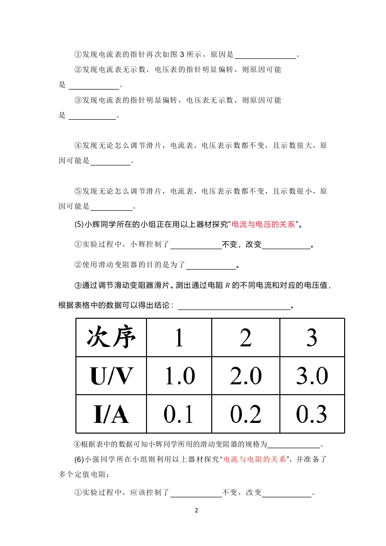 欧姆定律探究实验的“拓展”转自微信公众号《物理消消乐》“探究欧姆定律的实验是平时考试及中考的重难点题型,这里面到底有哪些知识点呢?又会怎么考呢?“下面,我们就通过一道例题给同学们呈现考点吧!常规考点例1:巴蜀常春藤学校的同学们在老师的指导下探究电流与电压和电阻的关系。所用的器材有电压表、电流表、三种不同规格的滑动变阻器(A:“1021.5A"、B:“4020.2A”、C:“2020.6A")、开关、新干电池两节、四个定值电阻(52、102、152、202)、导线若干。三三三二0.23R00.60.6图1图2消消护图3(1)请依照如图1所示的电路图,用笔画线代替导线将图2中电路连接完整,要求滑动变阻器的滑片P向左滑时,电流表示数变大。导线不能交叉:(2)闭合开关前,要将滑动变阻器滑片移至(填“左”或“右"门端,这样做可以起到的作用,同时发现电流表的指针如图3所示,原因是(3)当小刚把最后一根导线连好后,发现电流表的指针立马偏转到最大刻度,检查后发现连线正确,请你指出他在实验中两个操作不当之处:①②(4)小刚排除了错误,但由于电路中某处还存在问题,闭合开关后:1