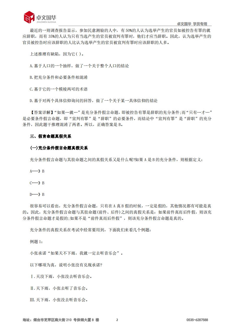 卓文国华ZHUOWEN GUCHUA卓文国华学员专用行测高频考点技巧二:判断推理之假言命题在公务员行测考试中,“假言命题”这一知识点每年都会有所涉及,其中“假言命题的推理规则”又是一个高频考点,这无疑成了我们广大考生复习的重点。一、假言命题的概念及分类所谓假言命题就是陈述事物情况之间条件关系的命题,亦称条件命题。根据肢命题间条件关系的不同可以分为三种:充分条件假言命题、必要条件假言命题和充分必要条件假言命题。充分条件假言命题是陈述某一事物情况是另一件事物情况的充分条件的假言命题。所谓A是B的充分条件是指一种“充足但不必需”的条件,即由A这个条件就能得出B结论:但没有这个条件却不一定得不出这个结论。充分条件假言命题最常用的联结词是“如果…那么…”;“如果”后面的肢命题称为前件:“那么”后面的肢命题称为后件。其他常用的还有“只要…,就…、一…,就…、若…,则…、…必须…”必要条件假言命题是陈述某一事物情况是另一件事物情况的必要条件的假言命题。所谓“C是D的必要条件”含义就是:“C是D的必需但不充足的条件,C与其他条件一起才能得到D,没有C就一定得不到D”。“只有…,才…”是必要条件假言命题最常用的联结词。其他常用的还有“不…,不…、除非…,否则不…、没有…,没有…”。充分必要条件假言命题是陈述某一事物情况是另一件事物情况的充分必要条件的假言命题。逻辑联结词通常为“当且仅当”。日常词项中通常还用:“只要而且只有…,才…、若…则…,且若不…则不…、当且仅当…则…”。充分必要条件的含义是“充足且必需”的意思。“E是F的充分必要条件”的含义是:“E是F的充足且必需的条件”。二、充分条件和必要条件的转化充分条件和必要条件之间存在着密切联系,这就是:如果p是q的充分条件,那么q就是p的必要条件:如果p是q的必要条件,那么q就是p的充分条件。所以,“如果p,那么q”等值于“只有q,才p”:“只有p,才q”等值于“如果q,那么p”。例如,“如果小红不吃饭,那么小明吃饭”等值于“只有小明吃饭,小红才不吃饭”。“小红不吃饭”是“小明吃饭”的充分条件,同时,“小明吃饭”是“小红不吃饭”的必要条件。充分条件和必要条件之间的转化关系虽然比较简单,但是在公务员考试中会经常出现。例题:地址:烟台市芝罘区南大街210号供销大厦8楼0535-6287588