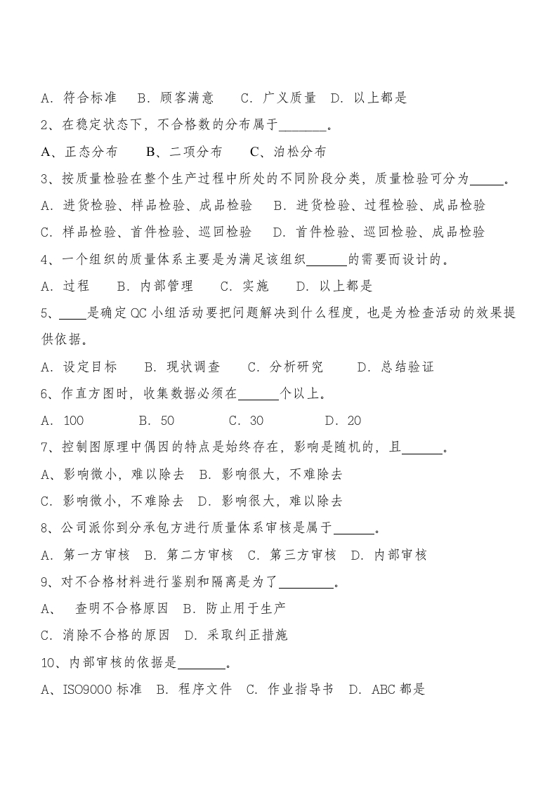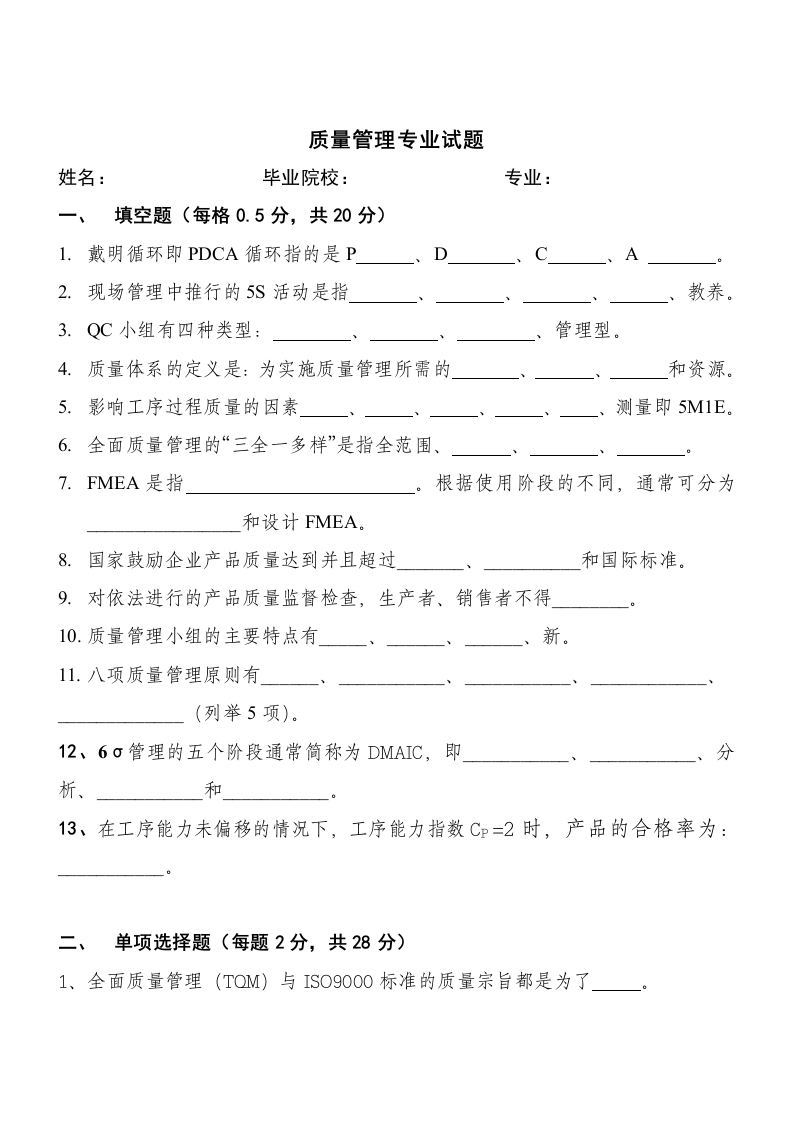 质量管理专业试题姓名:毕业院校:专业:一、填空题(每格0.5分,共20分)1.戴明循环即PDCA循环指的是P2.现场管理中推行的5S活动是指教养。3.QC小组有四种类型:管理型。4.质量体系的定义是:为实施质量管理所需的和资源。5.影响工序过程质量的因素测量即5M1E。6.全面质量管理的“三全一多样”是指全范围、7.FMEA是指根据使用阶段的不同,通常可分为和设计FMEA。8.国家鼓励企业产品质量达到并且超过和国际标准。9.对依法进行的产品质量监督检查,生产者、销售者不得10.质量管理小组的主要特点有新。11.八项质量管理原则有(列举5项).12、6σ管理的五个阶段通常简称为DMAIC,即分析、和13、在工序能力未偏移的情况下,工序能力指数C=2时,产品的合格率为:二、单项选择题(每题2分,共28分)1、全面质量管理(TOM)与ISO9000标准的质量宗旨都是为了