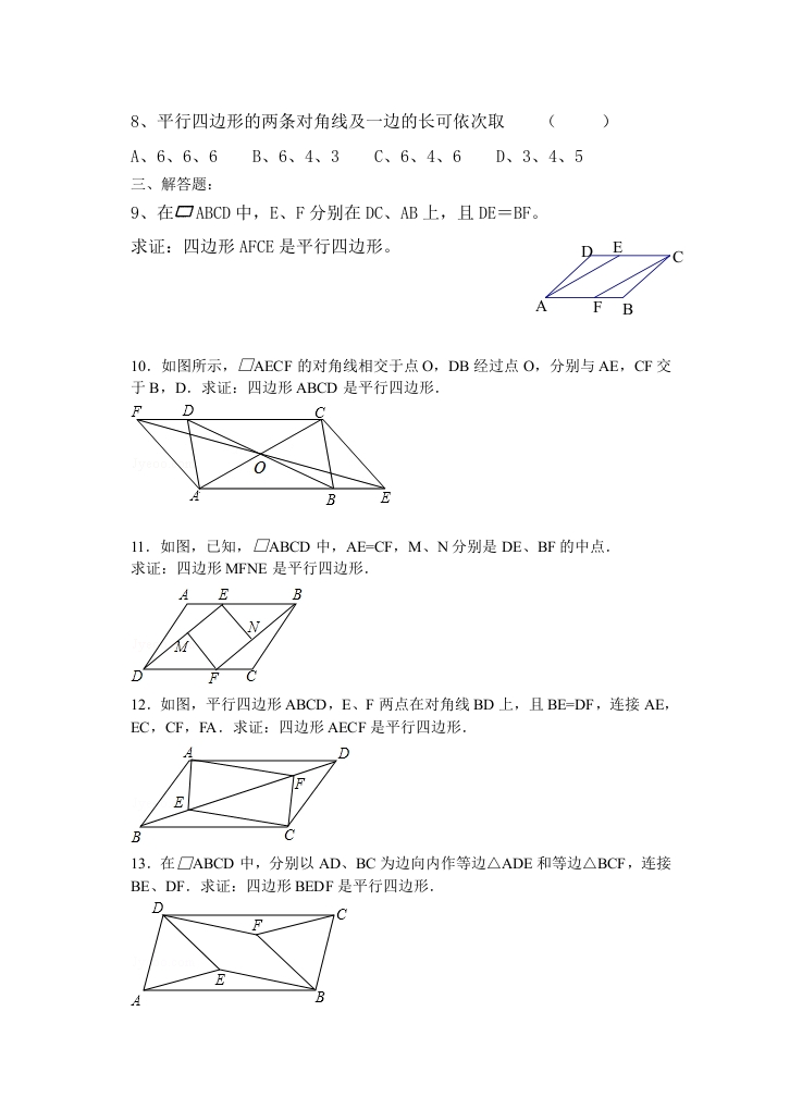 平行四边形习题课一、填空题:1.已知,如图,在□ABCD中,AB-4cm,AD=7cm,∠ABC的平分线交AD于点E,交CD的延长线于点F,则DF=cm。2.如图,在□ABCD中,DE平分∠ADC交BC于E,AF⊥DE于F,已知∠DAF=48°,则∠B3.已知,在□ABCD中,AB=4,BC=6,BC边上的高AE=2,则DC边上的高AF的长是4.如图,在□ABCD中,AD、BC间的距离AF=20,AB、CD间的距离AE=40,∠EAF=30°,则AB=,BC=ABCD的面积为(第1题)B(第2题)(第3题)(第4题)5.如图所示,在口ABCD中,AE⊥BC于E,AF⊥CD于F,∠BAD=120°,BE=2,FD=3,则∠EAF=,口ABCD的周长为一。B E二、选择题:6.平行四边形一边长为10,一条对角线长为6,则它的另一条对角线长a的取值范围为()A.4