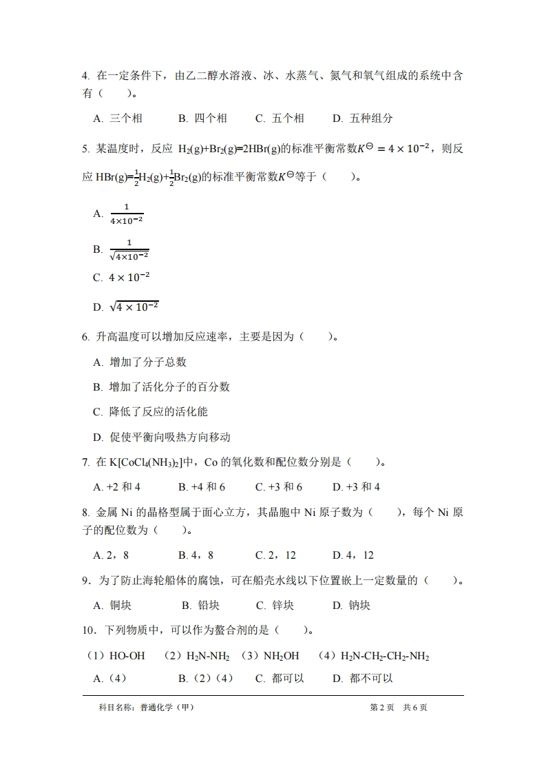 中国科学院大学2020年招收攻读硕士学位研究生入学统一考试试题科目名称:普通化学(甲)考生须知:1.本试卷满分为150分,全部考试时间总计180分钟。2.所有答案必须写在答题纸上,写在试题纸上或草稿纸上一律无效。3.可以使用无字典存储和编程功能的电子计算器。一、选择题(单选,请选择最合适的答案,每小题2分,共34分)1.下列物质各10克,分别溶于1000克苯,溶液的凝固点最低的是()。A.CH2Cl2B.CCl4C.CHCI3D.CH3CI2.有一个半透膜,将两个浓度不同的蔗糖水溶液隔开,其结果是()。A.蔗糖从浓溶液向稀溶液渗透B.水从浓溶液向稀溶液渗透C.水从稀溶液向浓溶液渗透D.蔗糖从稀溶液向浓溶液渗透3.在下列反应中,进行1mol反应时放出热量最大的是()。A.CH4(①)+2O2(g=CO2(g+2H20(g)B.CH4(g+202(g)=C02(g+2H2O(g)C.CH4(g)+202(g)=CO2(g)+2H2O(I)D.CH(g)+20(g=C0(g+2H,00科目名称:普通化学(甲)第1页共6页
