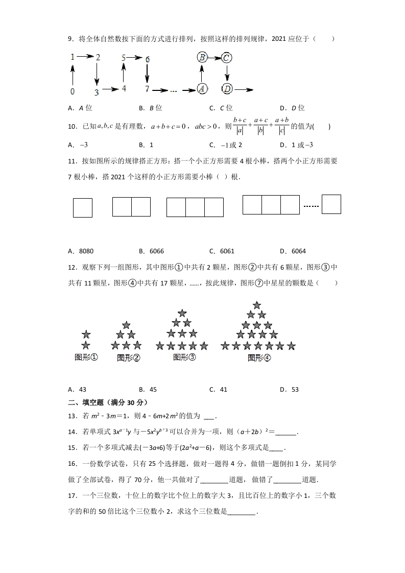 2021-2022学年苏科版七年级数学第一学期期末综合复习模拟测试题(附答案)一、单选题(满分30分)1.2021的相反数是()1A.-2021B.C.202120210.20212.张吉怀铁路将于2021年年底通车通车后从风凰到长沙仅需2个小时左右.张吉怀铁路全长246350公里耗资约3824亿元,则数据246350用科学记数法表示为()A.0.24635×10B.2.4635×10C.2.4635×109D.24.635×1093.下列说法正确的是()A.-2不是单项式B.-口表示负数C.30的系数是3D.x++1不是多项式4.一个几何体的三视图如图所示,这个几何体是()A.圆柱B.棱柱C.圆锥D.球5.观察下列等式:7°=1,7=7,7=49,7=343,74=2401,7=16807,根据其中的规律可得721的结果的个位数字是()A.9B.1C.7D.06.已知小红5岁,爸爸32岁,如果×年后小红年龄是爸爸年龄的二,那么可列方程(A.5+x=32×号8.5+x=2×好+xC.5+32+)0.5+x=32+7.如图所示的运算程序中,若开始输入的×值为50,我们发现第1次输出的结果为25,第2次输出的结果为32,,则第2021次输出的结果是()x为偶数输入x输出x为奇数A.1B.2C.4D.88.数a、b、c在数轴上对应的位置如图,化简|a+b|-c-b+|c+a-b的结果()a0c→A.-bB.e-aC.-c-aD.2a+b