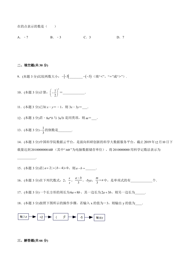 期中检测卷总分:120分范围:第1-3章难度:容易一、单选题(共24分)1.(本题3分)如果向东走3米,记作+3米,那么向西走4米,记作()A.1米B.7米C.-4米D.-7米2.(本题3分)一5的相反数是(11A.-C.5D.55B,33.(本题3分)下面选项中符合代数式书写要求的是()A.3行yB.ay3C.a'bD.axb+c44.(本题3分)己知m表示有理数,则m2一定是()A.负数B.非负数C.正数D.非正数5.(本题3分)下列计算正确的是()A.3a+2b=5abB.5y-3y=2xC.7a+a=8D.3xy -2yx2=xy6.(本题3分)下列是同类项的一组是()A.m与nB.-ad2b与-ab2C.ab与abcD.ab3与-3ba7.(本题3分)从数轴上表示-1的点先向右移动6个单位长度,再向左移动5个单位长度,得到一个点,则此时这个点表示的数是()A.2B.1C.0D.-28.(本题3分)点P从数轴的原点出发,第一次向右移1个单位长度,第二次向左移2个单位长度,第三次向右移3个单位长度,第四次向左移4个单位长度,,按照这个移动规律,请问:移动5次后,点P所