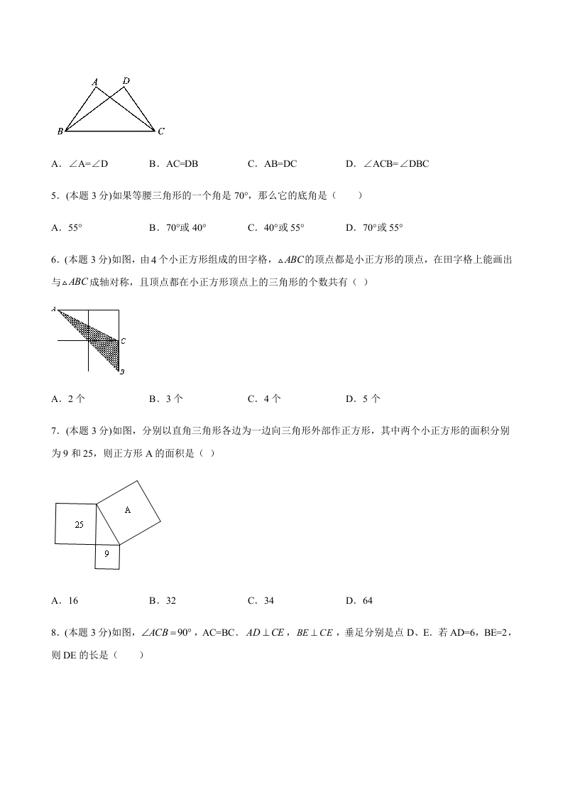 期中检测卷总分:150分范围:第13章难度:中等一、单选题(共24分)1.(本题3分)“致中和,天地位焉,万物育焉”,对称美是我国古人和谐平衡思想的体现,常被运用于建筑、器物、绘画、标识等作品的设计上,使对称之美惊艳了千年的时光,在下列标识或简图中,是轴对称图形的是()BD2.(本题3分)满足下列条件的△ABC不是直角三角形的是(A.a=1、b=2,c=3B.a=3、b=4,c=5C.a=9、b=40,c=41D.a=7、b=24,c=253.(本题3分)如图,在△ABC中,∠B=50°,将△ABC绕点A按逆时针方向旋转得到△AB'C.若点B恰好落在BC边上,则∠CB'C'的度数为()CA.50°B.60°C.80°D.100°4.(本题3分)如图,己知∠ABC=∠DCB,若再增加下列条件中的某一个,仍不能判定△ABC≌△DCB,则这个条件是()