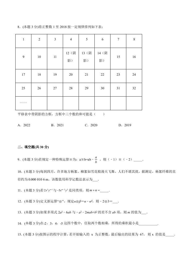 期中检测卷总分:120分范围:第13章难度:中等一、单选题(共24分)1.(本题3分)下列判断中正确的是()A.9x2-y+5y2是四次三项式B.a是一次单项式C.单项式的系数是2D.x2-2少是五次单项式22.(本题3分)下面计算正确的是()A.3x2x2-3B.3a2+2a-5aC.0.25ab+2ab0D.+3=3x3.(本题3分)当t=1时,多项式x3-yt+1的值为2,则当t=一1时,多项式x3-t一2的值为()A.0B.-3C.-1D.14.(本题3分)在中百超市,某品牌的食品包装袋上“质量”标注:500g+10g:下列待检查的各袋食品中质量合格的是()A.530gB.515gC.480gD.495g5.(本题3分)某商品先按批发价m元提高10%零售,后又降价10%出售,则最后的售价是()A.m元B.0.99m元C.1.21m元D.0.81m元6.(本题3分)下列说法:①绝对值是本身的数是正数:②最大的负整数是-1:③除以一个不为0的数,等于乘这个数的相反数:④”是分数:⑤单项式4×10x2的次数是5:⑥x与4心是同类项:其中正确说法的个数是()A.1个B.2个C.3个D.4个7.(本题3分)对于任意的整数a、b,规定aAb(dP-ab,则(一2)△3的值为()A.48B.32C.80D.88