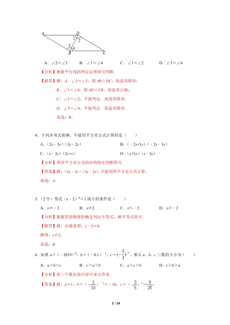 期中复习培优训练卷(期中模拟试卷B)-2020-2021苏科版七年级下学期数学(解析)一、选择题(本大题共有8小题,每小题3分,共24分.)1、下列运算中,正确的是()A.a2+a2=2a4B.a2.a=a5C.(-3x)3÷(-3x)=9x2D.(-ab2)2=-a2b4【分析】根据同底数幂的除法,底数不变指数相减:合并同类项,系数相加字母和字母的指数不变:同底数幂的乘法,底数不变指数相加:积的乘方法则:把每一个因式分别乘方,再把所得的幂相乘:对各选项计算后利用排除法求解.【解答】解:A、a2+a=2a2,合并同类项,系数相加字母和字母的指数不变:故本选项错误:B、·=π,同底数幂的乘法,底数不变指数相加:故本选项错误:C、(-3x)3÷(-3x)=9x2,同底数幂的除法,底数不变指数相减:故本选项正确:D、(-ab2)2=b4,积的乘方法则:把每一个因式分别乘方,再把所得的幂相乘:故本选项错误,故选:C.2、己知某种花粉的直径是0.000038m,数据0.000038用科学记数法表示为()A.38×105B.3.8×106C.3.8×105D.3.8×104【分析】绝对值小于1的正数也可以利用科学记数法表示,一般形式为a×10",与较大数的科学记数法不同的是其所使用的是负指数幂,指数由原数左边起第一个不为零的数字前面的0的个数所决定【解答】解:数据0.000038用科学记数法表示为3.8×105.故选:C.3、如图,下列条件能判断AD∥CB的是()1/14