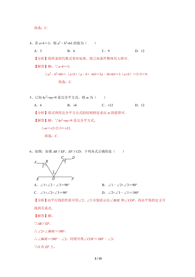 期中模拟试卷D-2020-2021苏科版七年级下学期数学(解析)一,选择题(本大题共有8小题,每小题3分,共24分.)1、下列各式中,计算正确的是()A.x+x3=x4B.(x4)2=x56C.x3x2=x10D.x8÷x2=x5(x0)【分析】直接利用同底数幂的乘除运算法则、幂的乘方运算法则分别计算得出答案,【解答】解:A、x+x,无法合并,故此选项错误:B、(x)2=x8,故此选项错误:C、xx2=x2,故此选项错误:D、x8x2=x6(寸0),正确.故选:D.2、下列代数式中能用平方差公式计算的是()A.(+y)(+y)B.(2x-y)(y+2x)C.(x+iyXy-ix)D.(-x+y)(y-x)【分析】平方差公式为:(a+b)(a-b)=2-b2,即一个数与另一个数的和乘以这个数与另一个数的差,等于相同数字的平方减去相反数字的平方.据此分析即可.【解答】解:A、两个括号内的数字完全相同,不符合平方差公式,故不符合题意:B、两个括号内的相同数字是2x,相反数字是(-y)与y,故可用平方差公式计算,该选项符合题意:C、没有完全相同的数字,也没有完全相反的数字,故不符合题意:D、两个括号内只有相同项,没有相反项,故不符合题意:故选:B.3、小明有两根3cm、7cm的木棒,他想以这两根木棒为边做一个三角形,还需再选用的木棒长为()A.3cmB.4cmC.9cmD.10cm【分析】易得第三边的取值范围,看选项中哪个在范围内即可,【解答】解:7-3=4,7+3=10,因而4<第三根木棒<10,只有C中的7满足.1/15