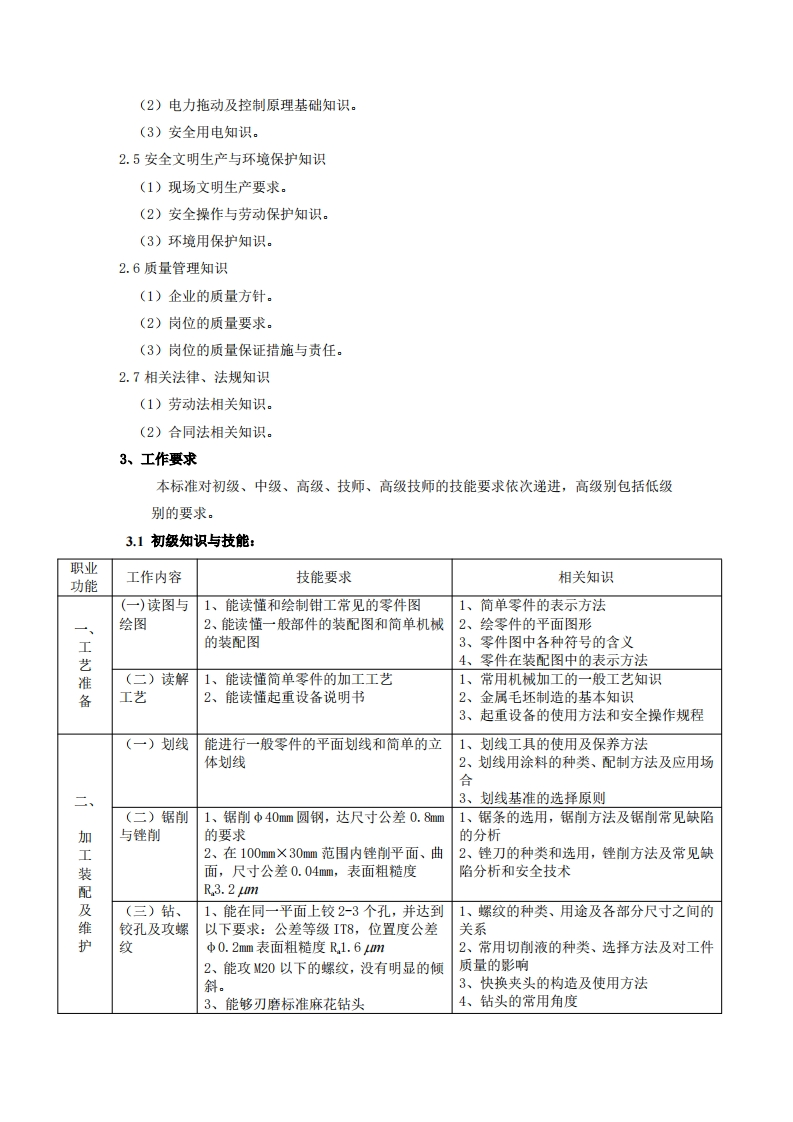 钳工技能实践考核鉴定大纲1、职业概况1.1职业名称:钳工1.2职业等级:本职业共设5个等级,初级、中级、高级、技师、高级技师:2、鉴定要求2.1职业道德2.1.1职业道德的基本知识2.1.2职业守则(1)遵守法律、法规和有关规定。(2)爱岗敬业,具有高度的责任心。(3)严格执行工作程序、工作规范、工作文件和安全操作规程。(4)工作认真负责,团结合作。(5)爱护设备及工具、夹具、刀具、量具。(6)着装整洁,符合规定:保持工作环境清洁有序,文明生产。2.2基础知识2.2.1基础理论知识(1)识图知识。(2)公差与配合。(3)常用金属材料及热处理知识。(4)常用非金属材料知识。2.2.2机械加工基础知识(1)机械传动知识。(2)机械加工常用设备知识(分类、用途)。(3)金属切削常用刀具知识。(4)典型零件(主轴、箱体、齿轮等)的加工工艺。(5)设备润滑及切削液的使用知识。(6)气动与液压知识。(7)工具、夹具、量具使用与维护知识。2.3钳工基础知识(1)划线知识。(2)钳工操作知识(錾、锉、锯、钻孔、绞孔、攻螺纹、套螺纹)。2.4电工知识(1)通用设备常用电器的种类及用途。