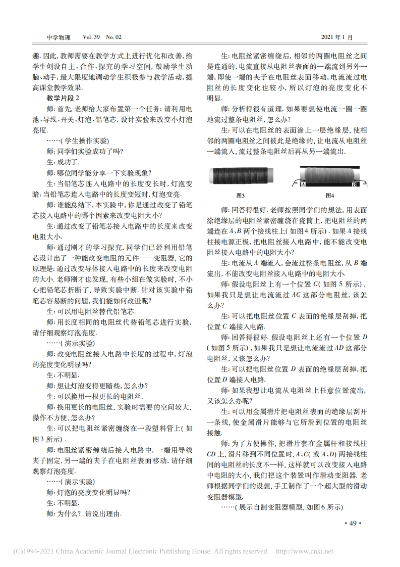 2021年1月Vol.39 No.02中学物理巧借创新实验提高初中物理课堂品质以人教版“变阻器”教学为例符方阳(佛山市华英学校广东佛山528000)摘要:物理学是一门以实验为基础的学科.通过实验,能够提高学生观察问题、分析问题、解决问题的能力·本文以笔者执教的“变阻器”一节为例,重点闲述如何巧借创新实验落实核心知识,提高课堂品质·关键词:初中物理:创新实验:高效课堂中图分类号:G633.7文献标识码:B文章编号:1008-41342021)02-0048-04物理学是一门以实验为基础的学科,物理概念的如果拉动蜘蛛丝,它会以一种特别的方式跟大家打招建立、物理规律的发现离不开实验.对初中学生来讲,呼.哪两位同学愿意上来体验下?实验是物理教学中重要的教学手段,对学生学习兴趣(两位学生上来,一人一边拉动蜘蛛丝,实验的提高和物理学科核心素养的养成起着尤其重要的情境如图2所示)作用.2019年10月,笔者应邀在广东省初中物理省级师:同学们看到蜘蛛侠以怎样的方式跟大家打骨干教师高端研修班教研活动中执教了“变阻器”一招呼?课,笔者通过自制的创新型实验教具,利用创新实验生:蜘蛛侠以“眨”眼睛的方式跟我们打招呼呢。高效地完成了本节课的教学.本文结合教学片段,重师:其实,老师事先已经在蜘蛛侠两只眼睛里分点阐述如何通过创新实验提升课堂品质,别安装了灯泡,并把它们接入到电路中.拉动蜘蛛丝1自主创新教具,激发学习兴趣时,眼睛里面的灯泡亮度发生了变化,给人“眨”眼睛物理学家爱因斯坦曾经说过“兴趣是最好的老的感觉.那么,为什么灯泡的亮度会发生变化呢?师.”激发兴趣是学生有效学习的前提条件,只有产生生:是因为通过灯泡的电流发生了变化了兴趣,学生才会去主动地学习,才能学好.因此,教师:同学们想知道通过灯泡的电流发生变化的原师要利用新奇有趣的实验,激发学生的探究欲望,使因吗?让我们一起来学习“变阻器”一课。学生在一种轻松有趣的氛围中学习,确保教学活动顺设计意图:一节好课首先要抓住学生的眼球,吸利有序地开展.引学生的注意力.在本节课的引入环节,教师通过自教学片段1制教具一会“眨眼睛”的蜘蛛侠,为学生创设新奇的师:同学们,今天老师给大家带来了一位新朋物理情境,刺激学生的感官,让学生在体验的过程中友一蜘蛛侠(展示道具盒,盒子前面画着蜘蛛侠图引发认知需求一为什么通过灯泡的电流会发生变案,如图1所示)化?不仅活跃了课堂气氛,而且使学生产生了浓厚的学习兴趣,激发学生强烈的探究欲望,为后面的探究活动做好准备·2构建实验模型,突破教学重点滑动变阻器的结构及原理是本节课的重点,在传MARVEL统初中物理教学中,教师往往采取的教学方式就是向图1图2学生展示滑动变阻器,试图用直观的方式给学生留下师:蜘蛛侠今天心情很好,特意吐出两条蜘蛛丝,深刻的印象,但这种方式的收益往往不高,学生对滑动变阻器的原理仍然比较模糊,不会因此产生学习兴基金项目:广东省教育科学“十三五”规划2020年度“强师工程”项目“基于创新实验发展学生物理学科核心素养的实践研究”(项目编号:2020YQJK161).作者简介:符方阳(1980-),男,海南文昌人,本科,中学一级教师,研究方向:实验教学.·48·(C)1994-2021 China Academic Journal Electronic Publishing House.All rights reserved.http://www.cnki.net