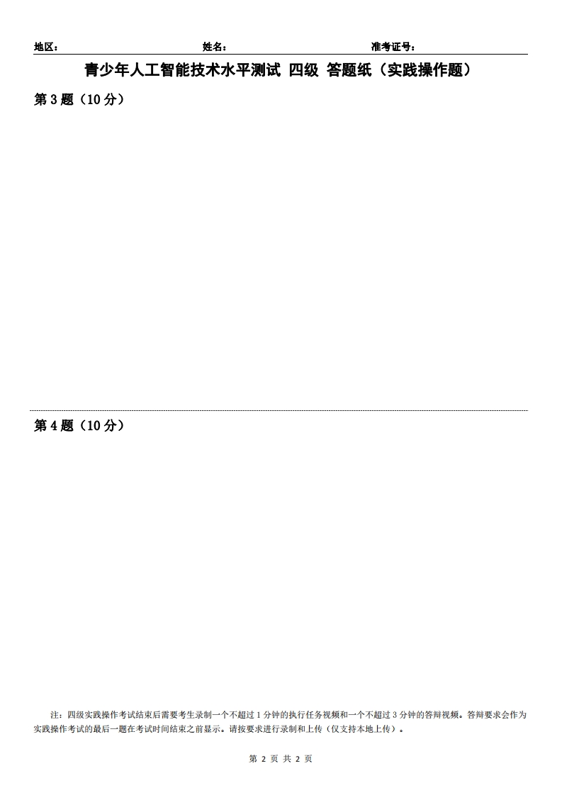 青少年人工智能技术水平测试4级答题纸348072@abc2个月前发布关注私信89.23KB2页03111青少年人工智能技术水平测试4级答题纸此内容为付费资源,请付费后查看¥11¥31黄金会员免费钻石会员免费立即购买您当前未登录!建议登陆后购买,可保存购买订单付费资源 第1页 / 共2页 第2页 / 共2页 已完成全部阅读,共2页 © 版权声明文章版权归作者所有,未经允许请勿转载。THE END初中教育学习资源小学教育教育学类高中教育高考真题 文本预览 地区:姓名:准考证号:青少年人工智能技术水平测试四级答题纸(实践操作题)第1题请按题目要求完成任务。(70分)第2题(10分)注:四级实践操作考试结束后需要考生录制一个不超过1分钟的执行任务视频和一个不超过3分钟的答舞视频。答辩要求会作为实践操作考试的最后一趣在考试时间结束之前显示。请按要求进行录制和上传(仅支持本地上传)。第1页共2页 查看更多 收起部分 喜欢就支持一下吧点赞11 分享QQ空间微博QQ好友海报分享复制链接收藏