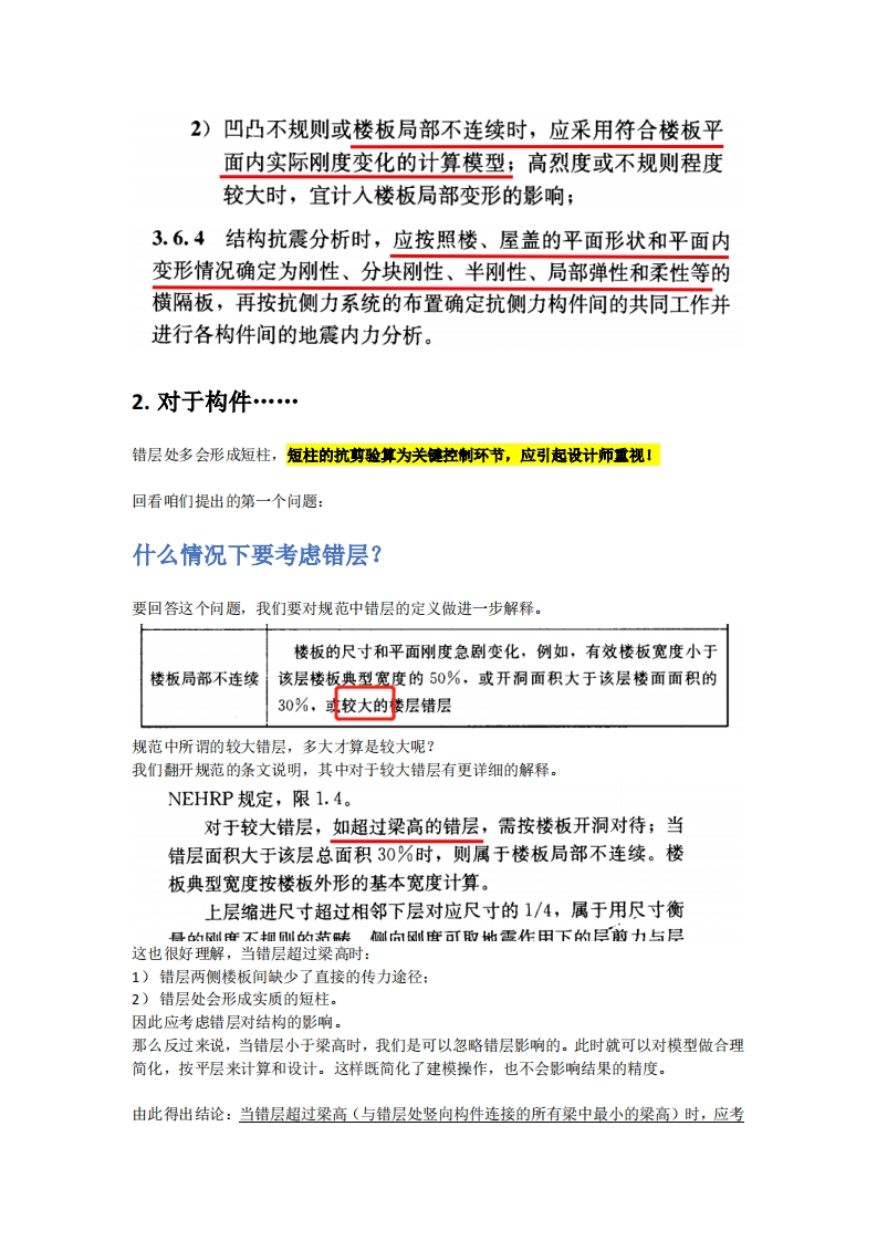 关于错层结构的建模与计算高上字前言首先,我们提出两个问题:1.什么情况下要考虑错层?2.错层要不要分层建?第一节错层对计算有哪些影响错层的影响:1)层指标;2)构件设计。1.对于层指标…较大的错层会导致平面楼板不连续,这种情况在统计指标时不能再简化为一个平面刚体,而应考虑错层对于指标统计的不利影响。《抗规》在相关章节也有提及:续表3.4.3-1不规则类型定义和参考指标凹凸不规则平面凹进的尺寸,大于相应投影方向总尺寸的30%楼板的尺寸和平面刚度急剧变化,例如,有效楼板宽度小于楼板局部不连续该层楼板典型宽度的50%,或开洞面积大于该层楼面面积的30%,或较大的楼层错层3.4.4建筑形体及其构件布置不规则时,应按下列要求进行地震作用计算和内力调整,并应对薄弱部位采取有效的抗震构造措施: