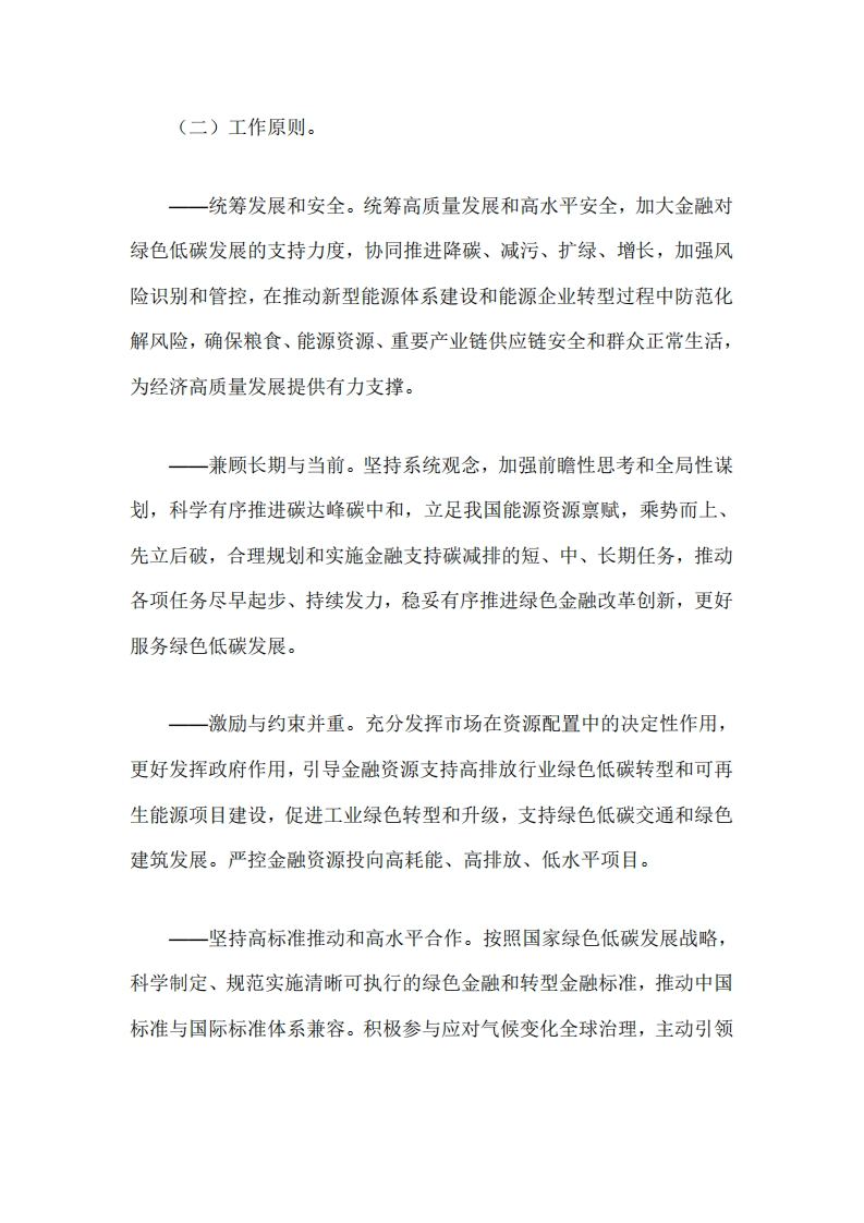 中国人民银行国家发展改革委工业和信总化部财政部生态环境部金融监管总局中国证监会关于进一步强化金融支持绿色低碳发展的指导意见中国人民银行上海总部,各省、自治区、直辖市及计划单列市分行,各省、自治区、直辖市及计划单列市、新疆生产建设兵团发展改革委、工业和信息化主管部门、财政厅(局)、生态环境厅(局),国家金融监督管理总局各监管局,中国证监会各证监局:为贯彻落实党中央、国务院关于碳达峰碳中和重大决策部署,做好绿色金融大文章,积极支持绿色低碳发展,经国务院同意,现提出如下意见。一、总体要求(一)指导思想。以习近平新时代中国特色社会主义思想为指导,全面贯彻党的二十大精神,深入践行习近平生态文明思想,坚持稳中求进工作总基调,立足新发展阶段,完整、准确、全面贯彻新发展理念,加快构建新发展格局,着力推动高质量发展,进一步强化金融对绿色低碳发展的支持,坚定不移走生态优先、节约集约、绿色低碳的高质量发展道路,为确保国家能源安全、助力碳达峰碳中和形成有力支撑。