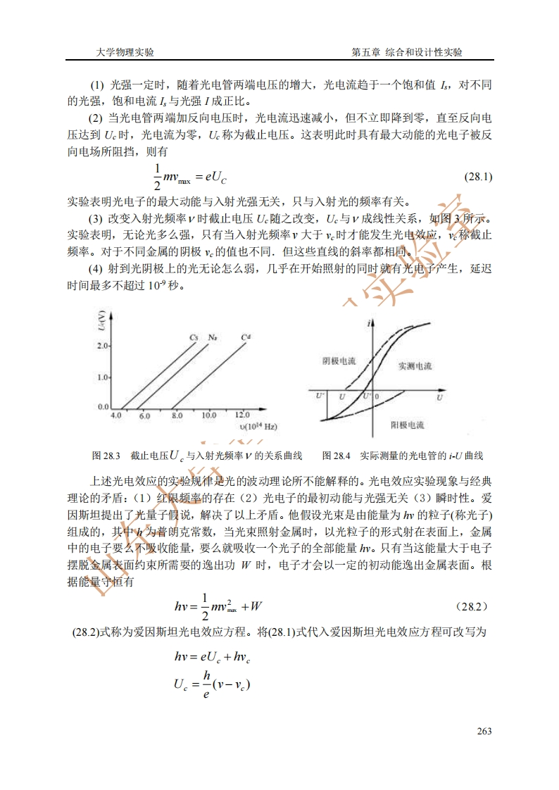 大学物理实验第五章综合和设计性实验光电效应测定普朗克常数(仿真实验)在近代物理学中,光电效应在证实光的量子性方面有着重要的地位。1905年爱因斯坦在普朗克量子假说的基础上圆满地解释了光电效应。约十年后,密立根以精确的光电效应实验证实了爱因斯坦的光电效应方程,并测定了普朗克常数。而今光电效应已经广泛地应用于各科技领域。利用光电效应制成的光电器件如光电管、光电池、光电倍增管等已成为生产和科研中不可缺少的器件。【实验目的】1.了解光电效应的基本规律。2.测量光电管的伏安特性曲线。3.验证爱因斯坦光电效应方程。4.测量普朗克常数。理实验【实验仪器】本实验仿真软件为科大奥锐公司的“大学物理仿真实验2010版”,对应真实实验的仪器有:光电管,光源(汞灯)滤波片组(5770nm,546.1nm,435.8nm,404.7nm,365nm滤波片),50%、25%、10%的滤光片,直流电源检流计(或微电流计)、直流电压计等。【实验原理】1.光电效应与爱因斯坦方程人)以合适频率的光照射在金属表面上,、有电子从表面逸出的现象称为光电效应。观察光电效应的实验示意图如图281所示。GD为光电管,K为光电管阴极,A为光电管阳极,G为微电流计,V为数字电压表,R为滑线变阻器。调节R可使A、K之间获得从-U到0到+U连续变化的电压。当光照射光电管阴极时,阴极释放出的光电子在电场的光强>山-Ue图28.1光电效应实验示意图图28.2光电管的伏安特性作用下向阳极迁移,并且在回路中形成光电流。光电效应有如下的实验规律:262