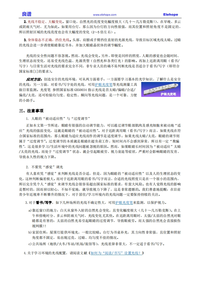 良谱www.elehope.comElehope光对眼睛的影响、常见问题、应对方法一、光对眼睛的影响人眼是在自然光下进化而成的智能感觉器宫。光线进入眼睛时,眼睛会根据光的特性自动调节瞳孔大小以控制进入眼睛的光通量、自动调节晶状体的弯曲度以使得成像落在视网膜上、自动替换感光细胞(锥状细胞和杆状细胞)以扩展人眼所能感受的光角膜线亮度范围。为看清不同距离和亮度的目标,眼部的肌肉及感光细胞有非常品状体强的自动调节能力。但在不安全的光线(太亮/太暗/不均匀/不稳定)下看书壁孔/写字时,眼睛的调节幅度和频度很大,属于过度调节,时间长了会引起眼睛疲劳,并进而导致视力下降。所以,必须在安全的光线下看书、写字!睫状体视网膜玻璃体安全的光线环境对眼睛极其重要,国家给各种室内照明情况制定了严格的标准(GB50034-2013)四,然而,非常可惜的是,普通民众对此关注度不高,绝大多数人还是停留在凭“感觉”来判断光线是否合适的阶段,这对于近距离用眼的看书/写字(对光线的要求很高)而言,存在着明显的风险,很多儿童的视力问题都与此相关。二、常见问题、应对方法(一)不区分生活用灯和学习用灯日常生活对于光线的亮度要求低,可接受的亮度范围非常大(>75-100Lx即可,且几乎没有上限),对光线的稳定性要求也不高,一般的屋顶灯基本都适用。但是,学习(看书/写字)是近距离用眼,且持续时间长,它对于光线的要求远高于一般的日常生活。适合于学习的光线亮度只是一个很小的范围(在300Lx附近)。一般的屋顶灯对于学习而言,会显得偏暗。应对方法:要区分生活用灯和学习用灯。通常屋顶灯作为室内主光源,供日常生活用:而台灯在学习(看书/写字)时为书桌提供合适的补光,这是比较合理的搭配。有兴趣的读者,不妨用“护眼光度笔”检测一下自己居所内各处的光线是否适合于学习。(二)光线的安全性问题1.学习环境内光源不合适,如过亮、过暗、不均匀、频闪、眩光/反光等。·光源过亮:过亮的情况会出现在白天窗口附近和晚上用台灯照明的桌面,因为晴天自然光非常强(极易超过10000Lx),台灯照射的中心区域光线也很强,易超标。·光源过暗:过暗的情况主要是阴雨天和傍晚的自然光:晚上室内只有屋顶照明、以及使用台灯时,照射区域边缘的光照。·光线不均匀:这种情况常发生于台灯,如在小范围的照射中心区域光线很亮,而其它区域偏暗或过暗。·光源频闪:频闪比较严重的主要是老式的日光灯、一些调光台灯、以及劣质品牌灯。·眩光/反光:眩光是指视野内有刺眼的亮点,如光源裸露在灯罩外面、灯罩边缘有亮斑、灯罩对着眼睛,那么就会产生眩光。反光是因为书本/桌面太过光滑,将刺眼的光源光线直接反射到了眼睛。