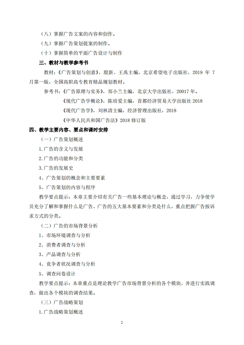 《广告与策划》课程教学大纲课程名称:广告与策划课程编码:适用专业:市场营销专业学时:64学分:3编写者:谢璐编写时间:2021.2审核者:陈潇潇审核时间:2021.2一、课程性质与任务通过对广告策划课程理论与实际案例的学习与探讨,使学员了解、认识、掌握广告策划的一些基本理论知识,特别是能进行广告策划书的实际动手编制,并能通过对实际案例的分析,从中汲取成功的经验和失败的教训。21世纪人类迅速进入信息化时代,企业的营销工作在一个新的环境新的平台下开展,促销组合是20世纪末就被营销学者和企业的营销工作者们所看重的营销利器,而广告正是促销组合中最为重要的手段。在消费者每天从众多的信息渠道获取信息的21世纪的今天,如何把信息更为有效地传递给消费者,成为企业的促销重点,也为企业的广告策划提出了新的要求,作为培养专业人才的高等院校,为适应新形势的需要,通过开设《广告策划》课程,旨在为企业和社会输送具备广告策划能力的专业人才。二、教学目的与基本要求学生通过学习该门课程能够了解进行广告策划的一般思路和过程,掌握广告策划的基本方法和手段,并具备综合应用广告策划技巧,并制作简单广告作品的能力。本课程的具体要求是:(一)掌握广告策划的基本操作、基本概念。(二)掌握广告策划的市场背景分析。(三)掌握广告战略策划。(四)掌握广告策划的内容和制作流程。(五)掌握广告调查的内容、程序和方法。(六)掌握告定位的方法的具体内容。(七)掌握广告创意的步骤和关键。